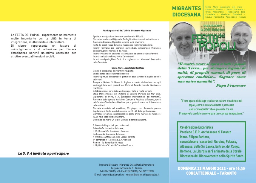 La Migrantes diocesana annuncia la Festa dei popoli che si terrà domenica 22 maggio a partire dalle 16.30 in Concattedrale.
