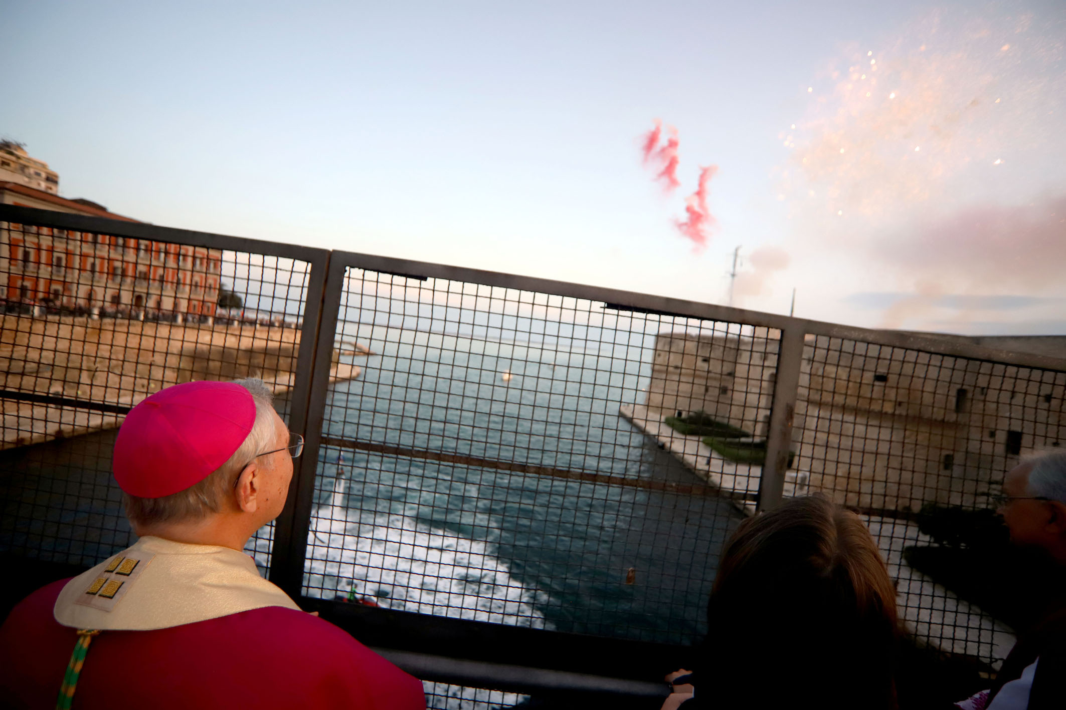 A questa città vorrei rinnovare l’invito a non avere paura, a ciascuno l’esortazione di rimboccarsi le maniche nel proprio ambito, con coscienza, con amore disinteressato, con responsabilità. Vorrei dire ad ognuno: il cambiamento di Taranto comincia da te! Da te Dio si aspetta la collaborazione e offre il suo aiuto. Noi non finiremo mai di richiamare il Governo a non defilarsi da questa terra a cui tanto deve in termini di devastazione ambientale, ma nessun Governo che potrà mai supplire a quello che ciascuno deve compiere per cantierizzare un mondo migliore! San Cataldo ci aiuterà ma ciascuno faccia la sua parte.