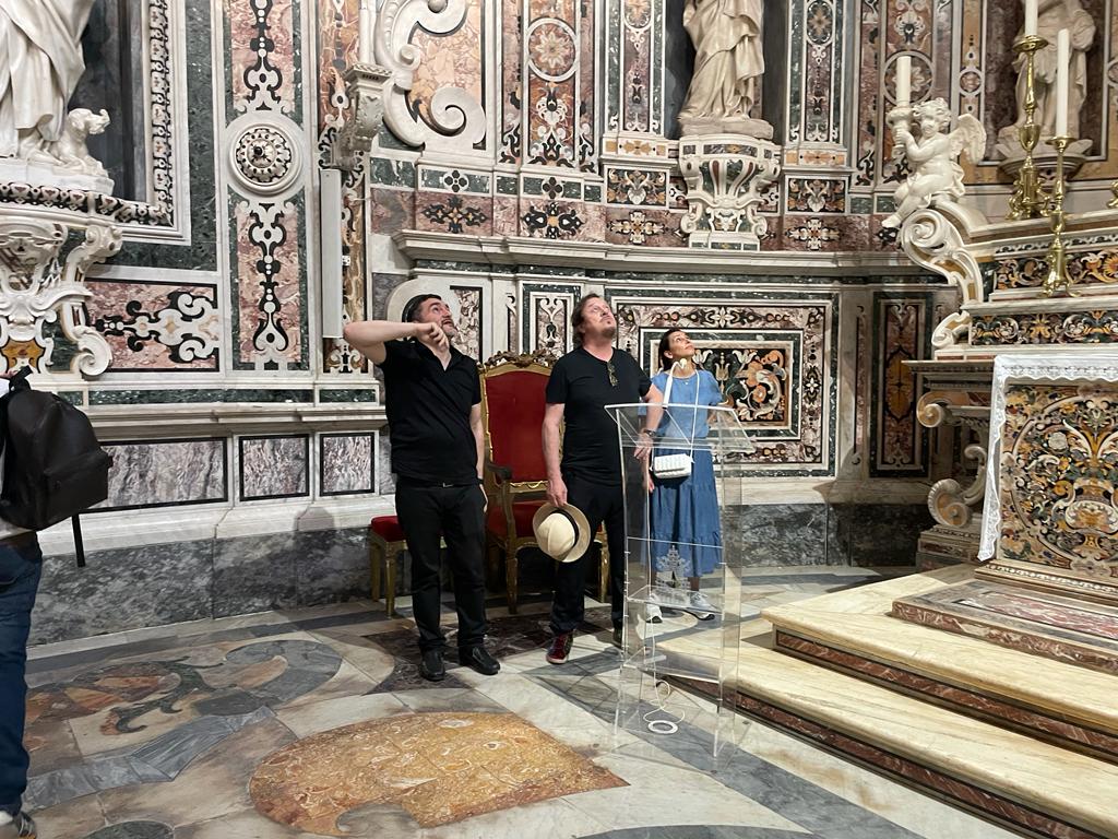 Accompagnato da don Emanuele Ferro, Elena Modio e Luca Adamo, è rimasto molto colpito dal Cappellone meravigliandosi di non averne mai sentito parlare prima.