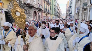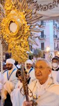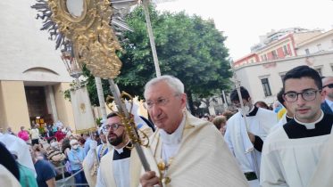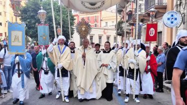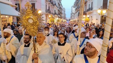 Nella Chiesa tante volte il tabernacolo è inconsapevolmente eclissato dagli affanni della vita e probabilmente anche da una prassi ecclesiale fatta di attivismi che ciecamente credono di non potersi rigenerare a questa fonte, ma oggi in questa solennità riaffermiamo che “l’Eucaristia fa la Chiesa e la Chiesa fa l’Eucaristia” (De Lubac). E l’Eucarestia fa anche il cammino sinodale della Chiesa; seguendo il Signore risorto, al quale siamo stati innestati nel Battesimo e celebrando l’Eucarestia noi diventiamo una cosa sola e quindi camminiamo insieme come oggi stiamo camminando per le vie di Taranto e di tutti i paesi della nostra Arcidiocesi. Il Signore vivo ci rende una cosa sola e ce lo fa annunciare e portare per le strade della vita.