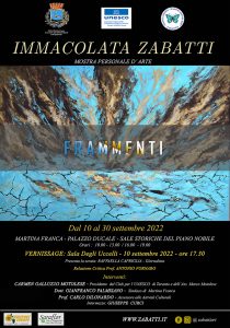 “Frammenti” è il titolo della mostra personale dell’artista Immacolata Zabatti che sarà inaugurata a Martina Franca, nella Sala degli Uccelli di Palazzo Ducale, il prossimo 10 settembre, alle ore 17.30. L’esposizione sarà allestita nelle sale storiche del piano nobile di Palazzo Ducale dal 10 al 30 settembre, visitabile negli orari 10-13 e 16-19. Carmen Galluzzo Motolese, presidente dell’associazione Marco Motolese e del Club per l’Unesco di Taranto presenta la mostra personale della pittrice Immacolata Zabatti, con il patrocinio del Comune di Martina Franca. “Nel 1997, a Parigi – dichiara la presidente Galluzzo – presso la direzione generale dell’Unesco, fu sancito lo Statuto dell’artista, il cui obiettivo era quello di valorizzare sempre di più il ruolo dell’artista per uno sviluppo culturale della società. Per rilanciare il significato dello stesso, noi del Club per l’Unesco di Taranto presentiamo Immacolata Zabatti con le sue opere di pregio, tre delle quali dedicate a Dante realizzate nel 2021, in occasione del settecentesimo anno dalla morte del grande poeta. Gli articoli 1 e 2 dello statuto – ricorda Galluzzo – così recitano: noi artisti, autori, riuniti dal 16 al 20 giugno 1997, dall’Unesco, (…) nell’ambito del Congresso mondiale (…), riaffermiamo, che la creazione artistica costituisce il patrimonio culturale del futuro. (…) Ricordiamo con forza che la facoltà di creare è una capacità particolare, la cui potenza e originalità provengono dall’artista, e che è importante incoraggiare la rivelazione e lo sviluppo del talento di ognuno, come manifestazione di una libertà fondamentale”.