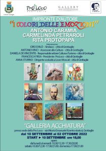 Sarà inaugurata il 10 settembre alle ore 18, nella sede della ProLoco di Grottaglie, in via Vittorio Emanuele II, la mostra pittorica dal titolo “Impronte d’autore – i colori delle emozioni” che vede protagonisti tre artisti della provincia di Taranto: Antonio Caramia, da Grottaglie; Carmelinda Petraroli, da San Giorgio Jonico; Rita Protopapa, di Talsano.