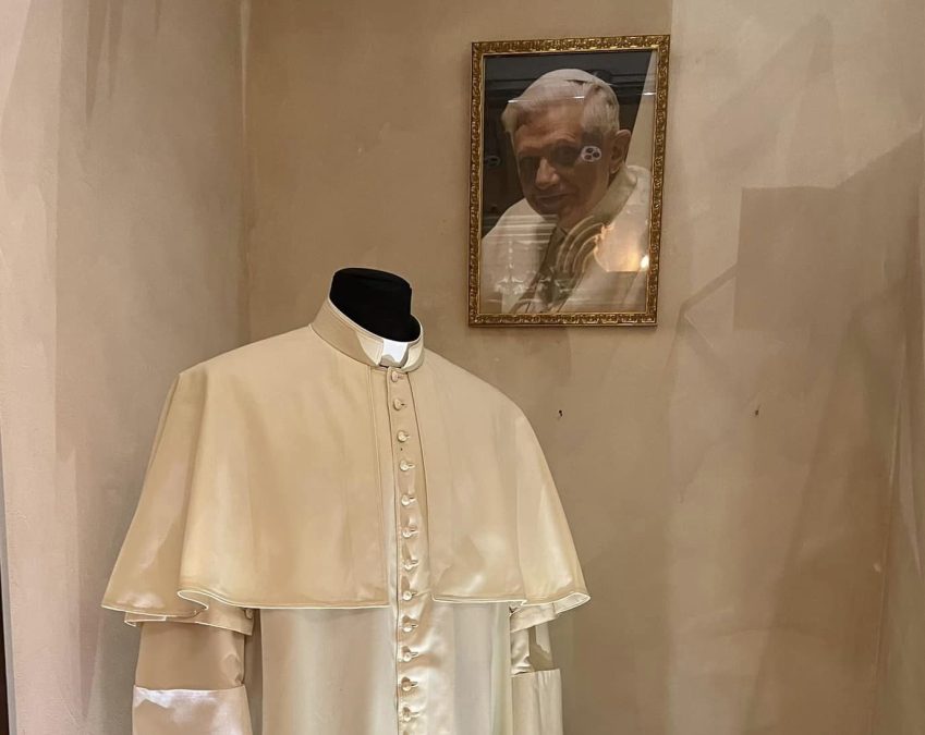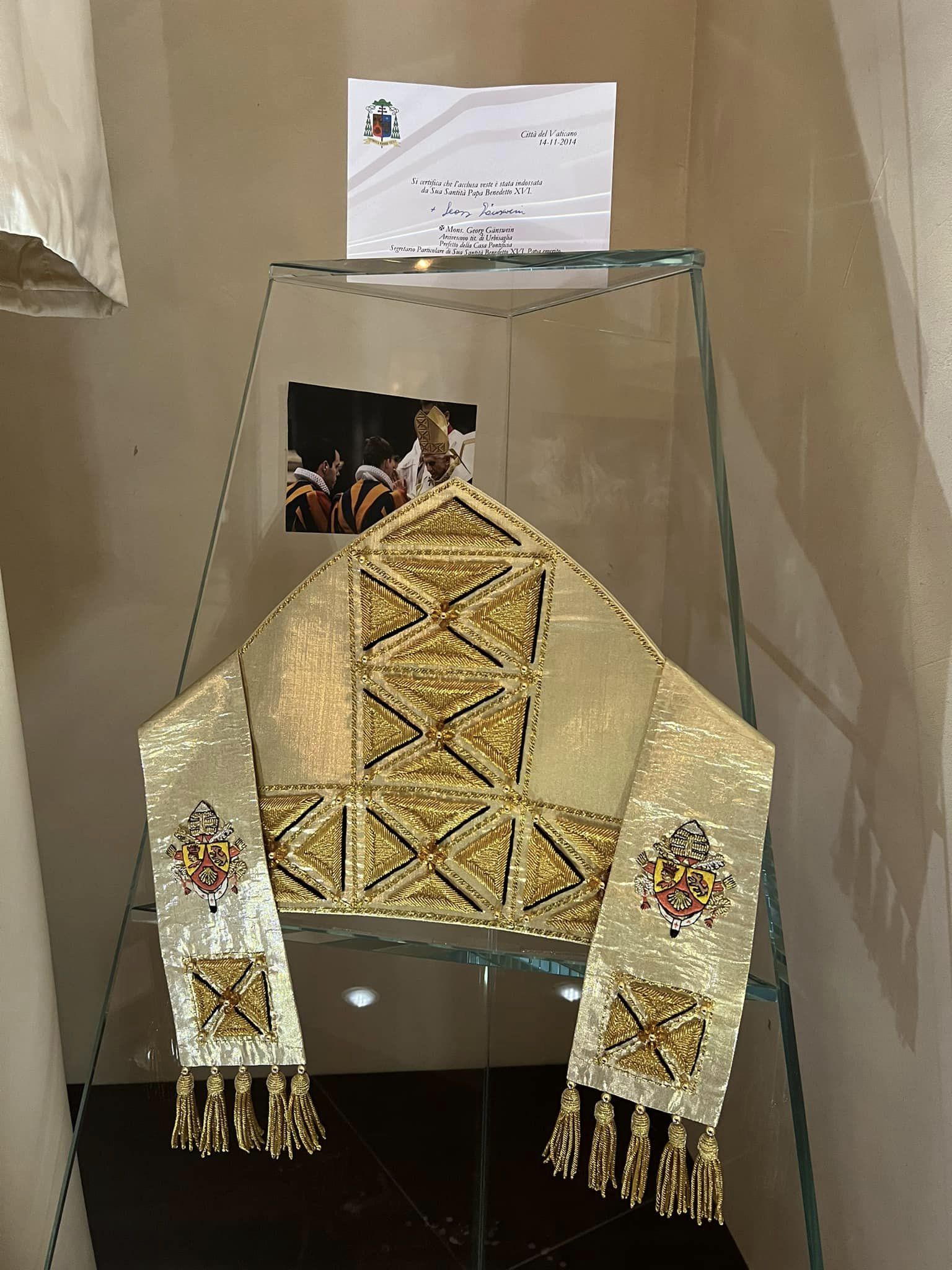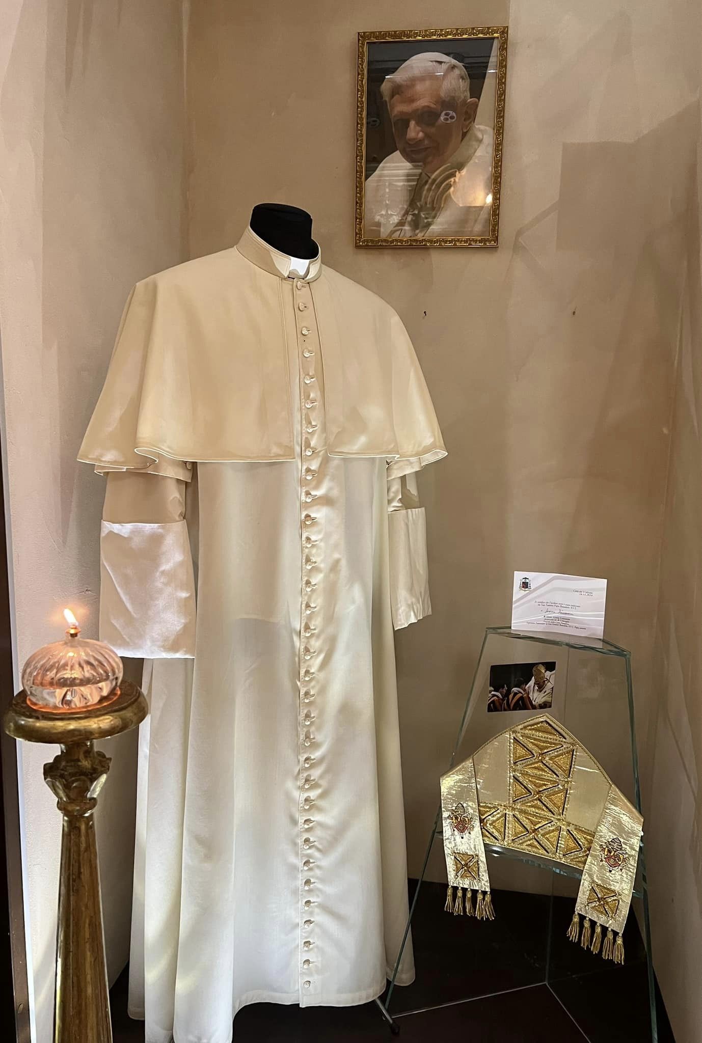 Una talare e una mitria esposti in Basilica, accanto agli ori dei Santi Martino e Comasia. Appartengono a Joseph Ratzinger, il Papa emerito che l’ultimo giorno dell’anno ha terminato il suo viaggio terreno.