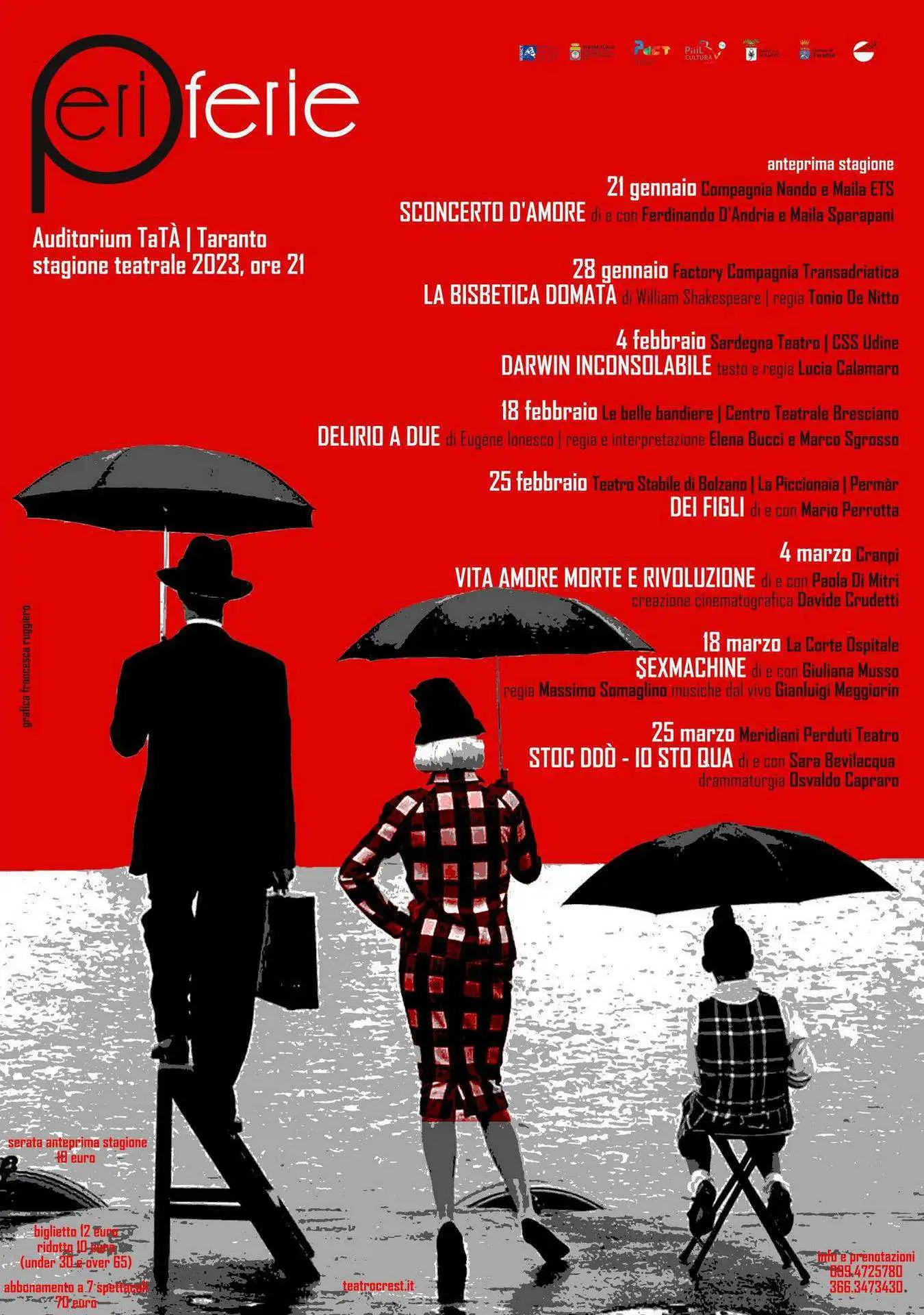 Sette spettacoli che condividono l’obiettivo di coinvolgere gli spettatori, facendo appello alle loro emozioni, ai loro vissuti quotidiani, ai loro sorrisi e alle loro preoccupazioni, perché il teatro deve essere occasione di nuova consapevolezza. Anche sette occasioni per il pubblico di incontrare e chiacchierare con gli artisti. Insomma, il sabato sera all’auditorium TaTÀ di Taranto si va per trascorrere una serata interessante, tra amici, per questo merita cominciare con una festa d’amore sì, ma che sconcerta.