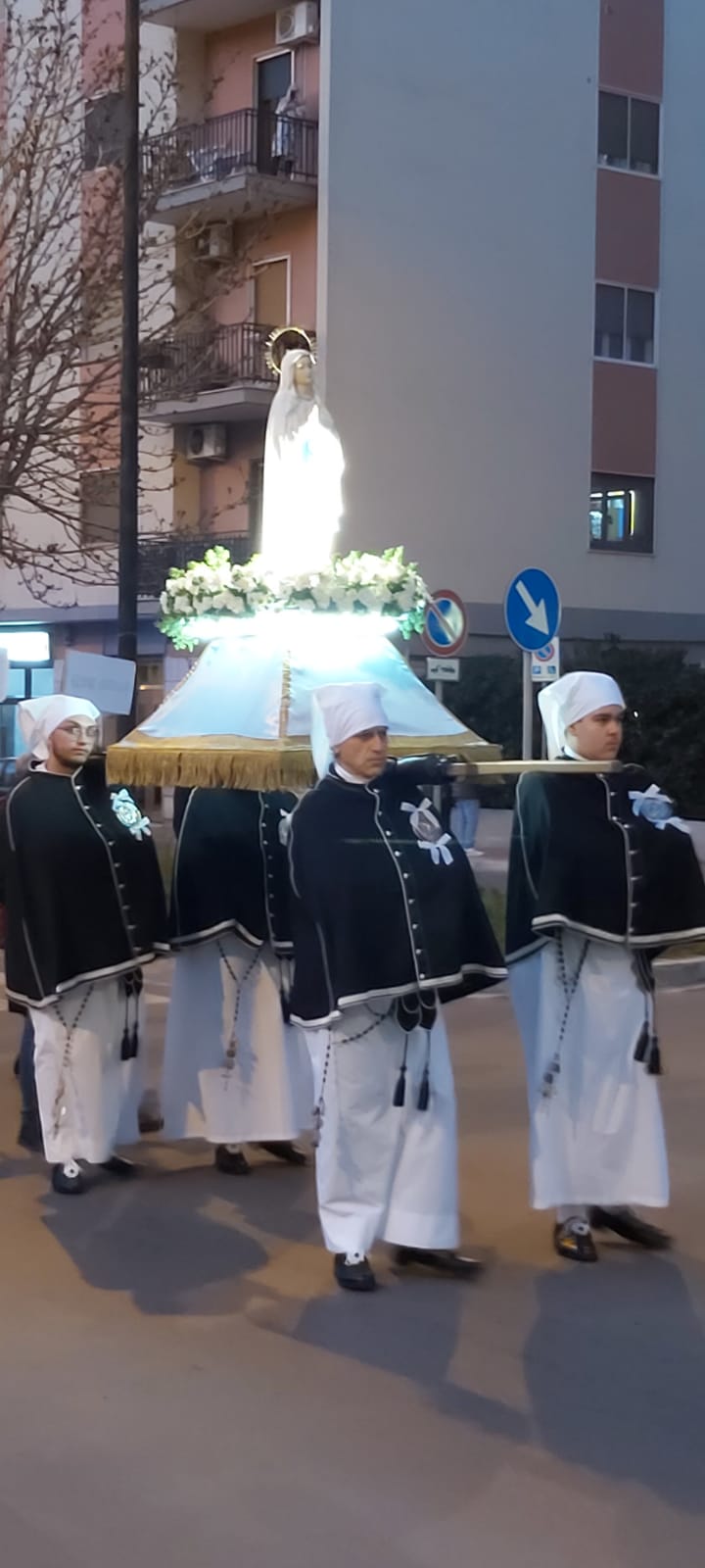 Nel pomeriggio si è svolta la processione per le vie del quartiere: c.so Italia, via Campania, via Emilia e viale Liguria. La statua è stata accompagnata dai confratelli dell’Addolorata in San Domenico, come ormai è lieta consuetudine da diversi anni. I parrocchiani e i fedeli hanno partecipato pregando intensamente, recitando il santo rosario e innalzando a Maria dei canti mariani. Alla processione ha partecipato anche una rappresentanza dei ragazzi della tappa crismale, i quali hanno trasportato uno striscione realizzato durante gli incontri di catechesi. Hanno fatto sentire la propria preghiera anche gli aderenti ai gruppi parrocchiali: l’Azione Cattolica, il Gruppo di preghiera di San Pio, la Rete mondiale di preghiera per il papa, la Caritas, il Coro, i ministri straordinari, i ministranti e i lettori. La giornata si è conclusa con la celebrazione della messa, presieduta dal parroco, don Antonio Rubino. Insieme con il vicario parrocchiale, don Mattia Santomarco e con tutti i fedeli, la comunità si è riunita per ringraziare e salutare ancora una volta all’unisono Nostra Signora di Lourdes, nella giornata a lei dedicata.
