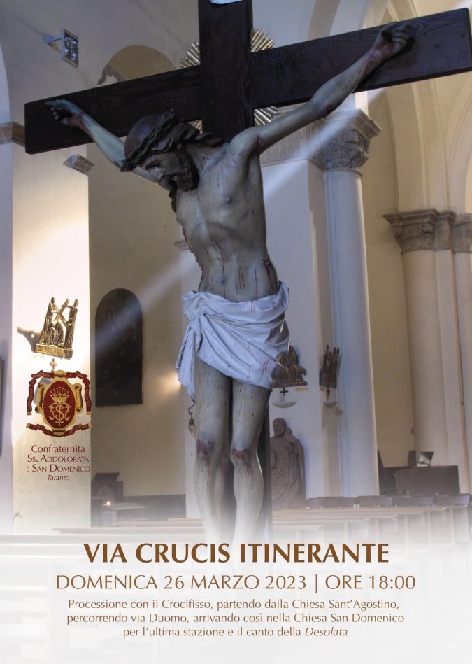 Domenica 26 marzo, alle ore 18, si terrà una Via Crucis itinerante organizzata dalla confraternita SS. Addolorata e San Domenico, nell’ambito delle iniziative per la Quaresima 2023.