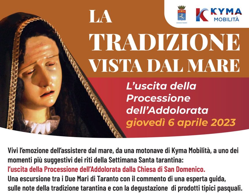«Kyma Mobilità partecipa ai Riti della Settimana Santa dando la possibilità a tutti, tarantini e turisti, di fare una straordinaria esperienza: assistere dal mare, a bordo di una motonave, all’uscita della processione della Madonna Addolorata dalla Chiesa di San Domenico!»: l’annuncio è di Alfredo Spalluto, presidente di Kyma Mobilità.