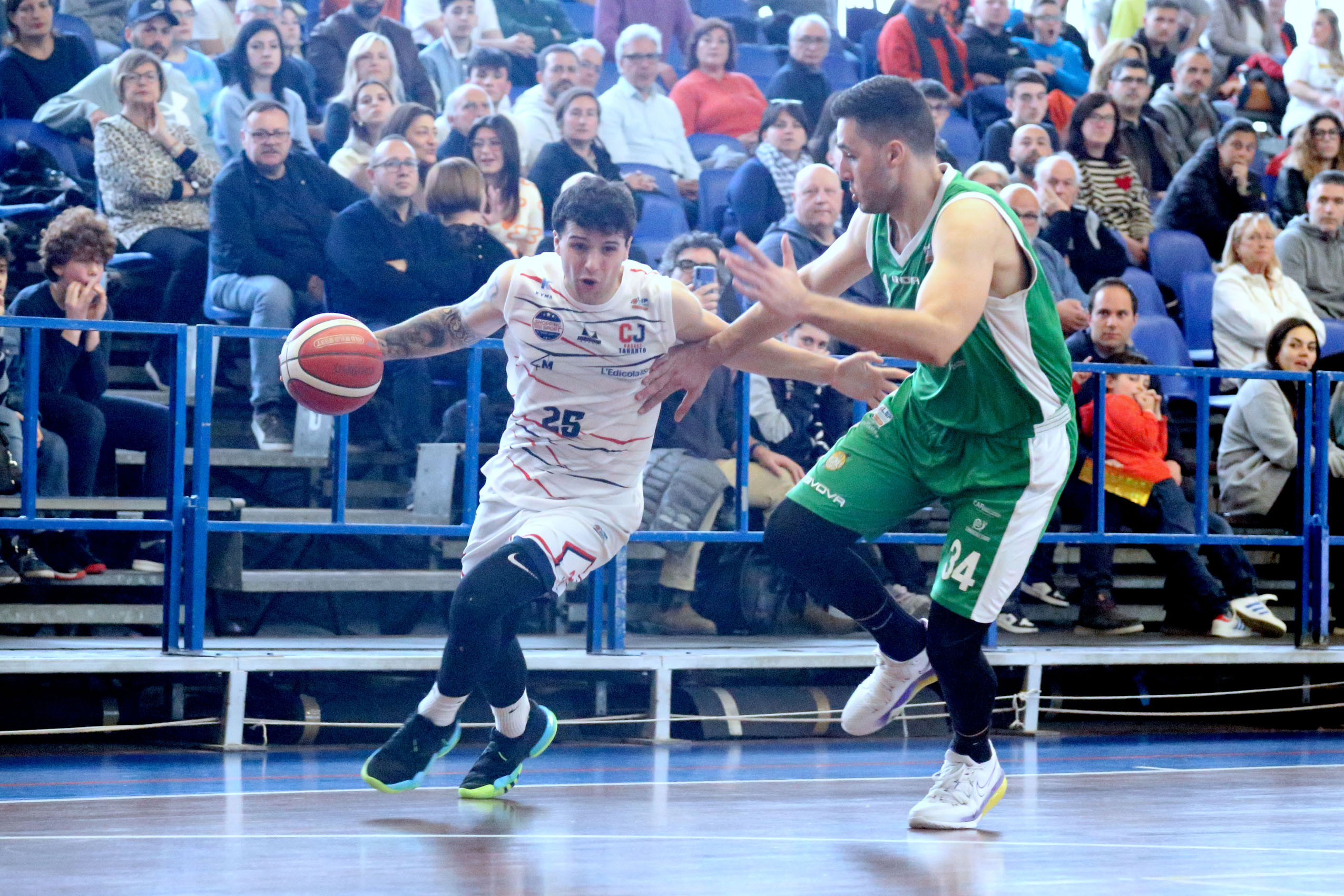 Coach Olive manda in campo Rocchi nel quintetto base, in compagnia di Villa, Conte, Corral e Bruno. Buona partenza dei padroni di casa nel primo quarto. Gli ospiti, che avevano firmato il primo canestro con Stella, rimontano e sorpassano; ma la reazione d’orgoglio di Taranto consente loro di aggiudicarsi il parziale (16-15). Si gioca sul filo dell’equilibrio anche il secondo quarto. Entra in campo il buon Sampieri, giovane interessante; ma è Corato a spuntarla. Nel secondo tempo gli ionici ingranano la quarta: vantaggio a doppia cifra, vanno a segno i tiri dalla lunga distanza. Nell’ultimo quarto le azioni si fanno più spettacolari. Taranto dà l’impressione di non volersi accontentare della vittoria – il vantaggio sale fino al +24 finale.