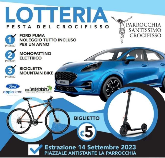 Per coprire le spese dell’organizzazione la parrocchia ha organizzato una lotteria con ricchi premi: il noleggio gratuito per un anno, tutto compreso, di una Ford Puma; un monopattino elettrico e una bicicletta mountain bike. Il biglietto potrà essere acquistato nell’ufficio parrocchiale o in diversi esercizi commerciali del quartiere che espongono l’apposita locandina, al costo di cinque euro. L’estrazione avverrà nel piazzale del santuario la sera del 14 settembre, nel corso della festa finale.