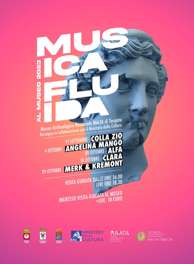Angelina Mango, Colla Zio, Alfa, Clara e Merk&Kremont. La musica più amata dai giovanissimi dal 15 settembre arriva al MArTa, il museo archeologico nazionale di Taranto, grazie alla rassegna Musica fluida, promossa dall’Orchestra della Magna Grecia, insieme alla direzione del MArTa e con il sostegno del Mic- Ministero della Cultura, della Regione Puglia, del Comune di Taranto e della Provincia di Taranto. Un percorso culturale che parte dall’archeologia per concludersi con la musica.