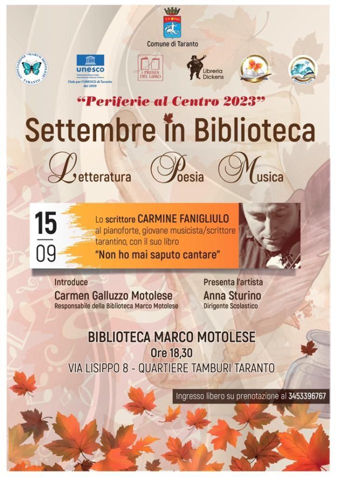 Annunciando l’iniziativa, Carmen Galluzzo Motolese, presidente dell’associazione Marco Motolese, ha spiegato che «con il progetto “Settembre in biblioteca” torniamo ad occuparci del Quartiere Tamburi che richiede una particolare attenzione da parte delle istituzioni. In questo progetto che “parla” di Libri e di Musica, preziosi collaboratori sono la libreria Dickens di Taranto, l’associazione Presidio del libro di Taranto e il Club per l’Unesco di Taranto che, in particolare, contribuirà all’organizzazione e la realizzazione degli eventi».