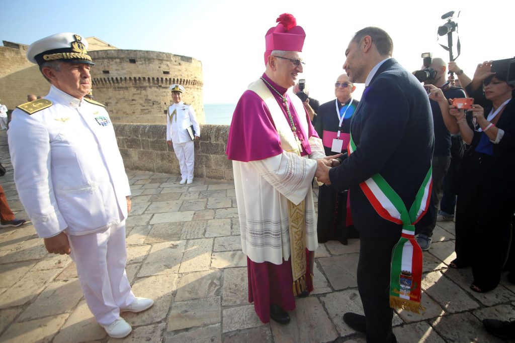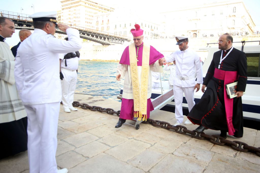 Il primo incontro è stato con la Marina Militare, sulla banchina. L’ammiraglio Flavio Biaggi, gli ha dato il benvenuto rinnovando i segni di amicizia che legano la Marina alla Chiesa di Taranto. Ed egli si è fatto interprete del patto di amicizia che lega la Chiesa all’istituzione, impegnata sul fronte della pace, impegnandosi a tenerlo saldo. “Seguendo la scia dei mii predecessori – ha detto – alla luce del messaggio consegnato da San Govanni Paolo II alla Marina Militare nel suo storico viaggio pastorale il 28 ottobre e1989. In esso affidava una triplice consegna di pace. Pace come vocazione che Taranto ha nei confronti del Mediterraneo e del mondo intero. Era chiaro il riferimento di Giovanni Paolo II al ruolo insostituibile della Marina Militare nella realizzazione di un così nobile ideale, che si concretizza attraverso la così generosa accoglienza dei profughi e dei migranti, Nella memoria di coloro che hanno perso la vita in mare, il cui ricordo è sempre vivo nei nostri cuori, e che abbiamo simboleggiato con la corona che abbiamo affidato al mare”.