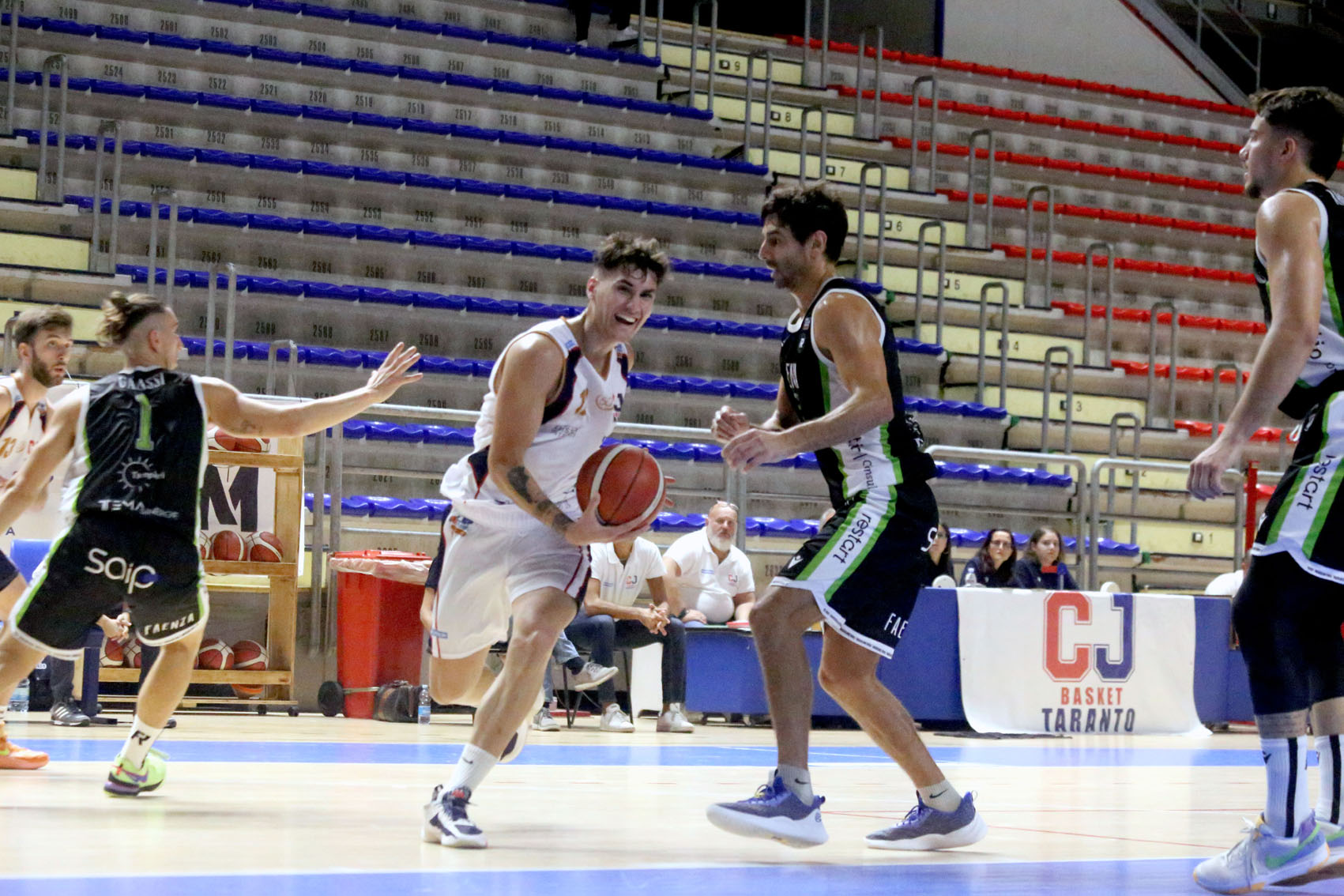 Nel secondo tempo il CJ difetta di precisione in attacco. Faenza vola sul +13 (44-57), domina a rimbalzo. Taranto prova a reagire (49-57), ma non c’è niente da fare. Nell’ultimo quarto la situazione non si ribalta. Ad evitare la seconda sconfitta consecutiva in campionato, non bastano i canestri di Thioune (il pivot senegalese è stato però falloso già nella prima parte di gara) e di Reggiani, in doppia cifra. Non basta l’impegno che è stato certamente messo in campo. Nemmeno la prestazione di Conte, dal quale sembrano dipendere i padroni di casa. Il gruppo allenato da Luigi Garelli vince con merito e ringrazia in particolare Simone Aromando – top scorer della serata con 18 punti.