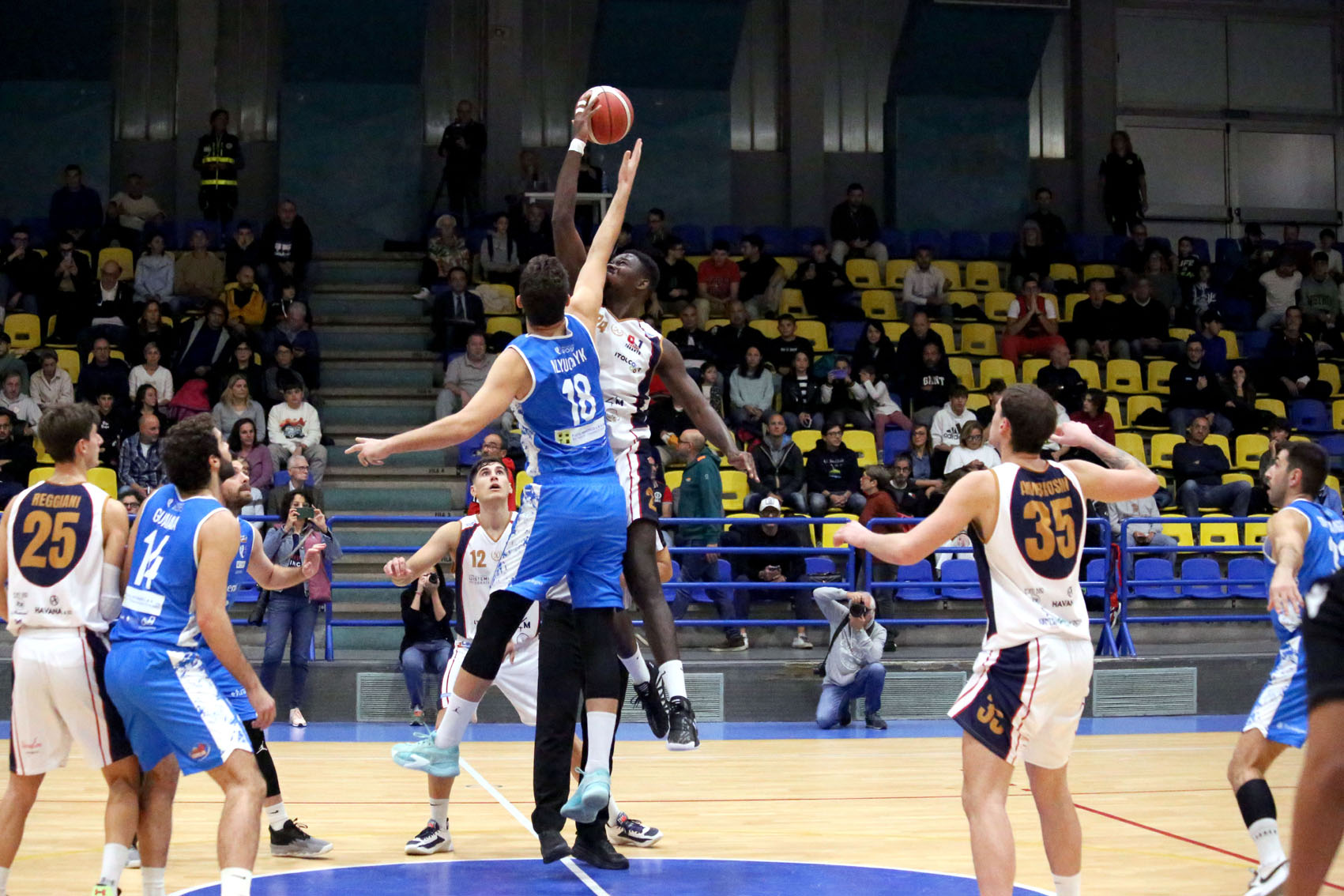 Il Cus parte con Valentini (recuperato), Reggiani, Thioune, Fresno e Ambrosin. Primo canestro di marca ospite. Lo firma Klyuchnyk. Risponde Thioune e Reggiani con una tripla. La partita è equilibrata. Il vantaggio della formazione ospite non supera i quattro punti. Qualche palla persa da ambo i lati, Conte a due minuti dal termine riporta avanti Taranto (14-13). Ma è Roseto poi a prevalere. Pesano, per gli ionici, gli errori dalla lunetta. Il parziale di chiude sul 15-22. Nel secondo, accorcia le distanze Thioune. Gli ospiti si portano sul +10 e oltre. Il primo tempo si chiude sul 42-29 in loro favore.