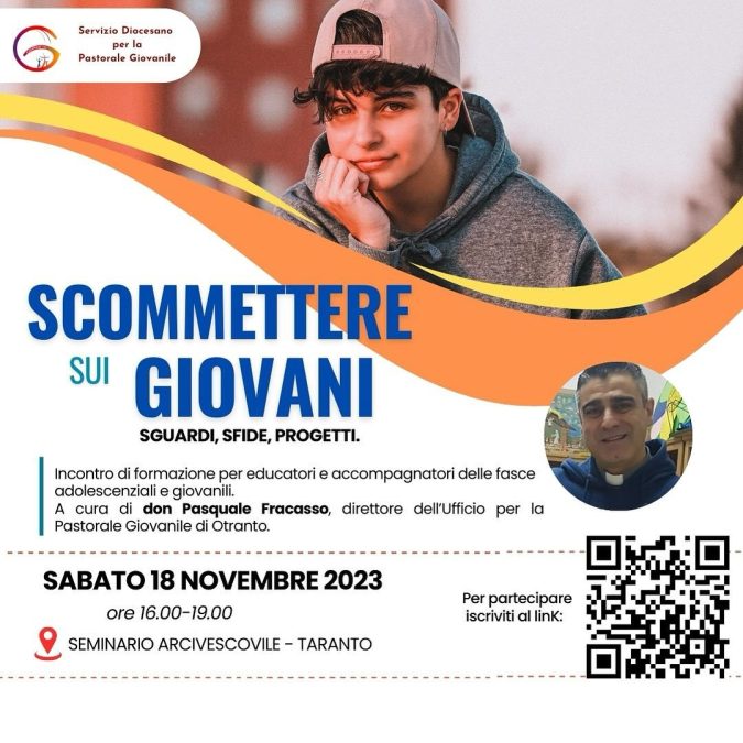 In un’epoca così complessa, i giovani necessitano di guide che non siano superficiali e non improvvisino nel loro compito. Per questo il servizio diocesano di pastorale giovanile, diretto da don Francesco Maranò, ha pensato di proporre un incontro formativo per gli educatori e gli accompagnatori delle fasce adolescenziali e giovanili intitolato “Scommettere sui giovani: sguardi, sfide, progetti”. L’appuntamento è per sabato 18 novembre dalle ore 16 alle ore 19 al seminario arcivescovile di Poggio Galeso. Relatore sarà don Pasquale Fracasso, direttore dell’Ufficio per la pastorale giovanile di Otranto, che svilupperà il tema della giornata.