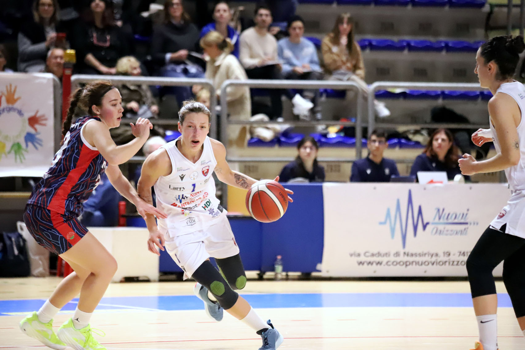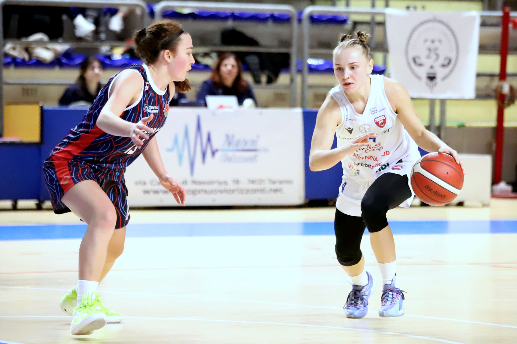 Starting lineup Nuovi Orizzonti: Tagliamento, Smaliuk, Ivaniuk, Lucchesini, Gismondi. Da segnalare, nella formazione avversaria, la presenza dell’ex Armenti, tornata in campo dopo sette mesi. Il primo canestro è una tripla di marca ospite. Risponde Smaliuk, sempre dalla lunga distanza. Ariano Irpino non sta a guardare. Sul 3-8 coach Orlando chiama subito time out e alza la voce. Il vantaggio della formazione campana, che anche dalla lunetta non sbaglia un colpo, supera i dieci punti. Nuovo time out chiamato dalla panchina ionica. Tra le mosse provate, l’ingresso di Martelli. La frazione si chiude sul punteggio di 8-22. Nel secondo quarto, cresce l’intensità della difesa; non l’attacco della Nuovi Orizzonti. Ariano Irpino si porta sul 27-8. Segue la reazione d’orgoglio delle padroni di casa che vanno a segno con De Pace, Tagliamento, Smaliuk; Ivaniuk dalla lunetta. Il primo tempo si chiude sul 36-23 per la formazione allenata da Antonio Belluzzi.