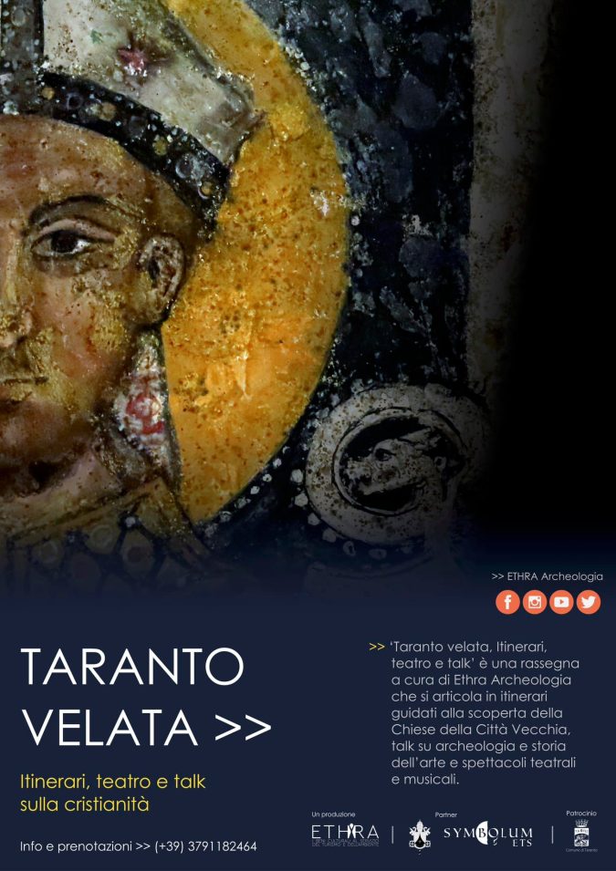 Alle ore 19, dal book shoop di San Cataldo, partirà il “Città vecchia Secret Tour”, un viaggio tra luoghi di culto, bellezze artistiche e leggende. Arte, religiosità popolare, tradizioni, archeologia: sono diverse le tracce di “Taranto Velata”, il progetto di Ethra Archeologia e Turismo per un percorso che unisce itinerari, spettacoli teatrali, talk, con l’unico scopo di promuovere e far conoscere tesori poco noti e non sempre fruibili.