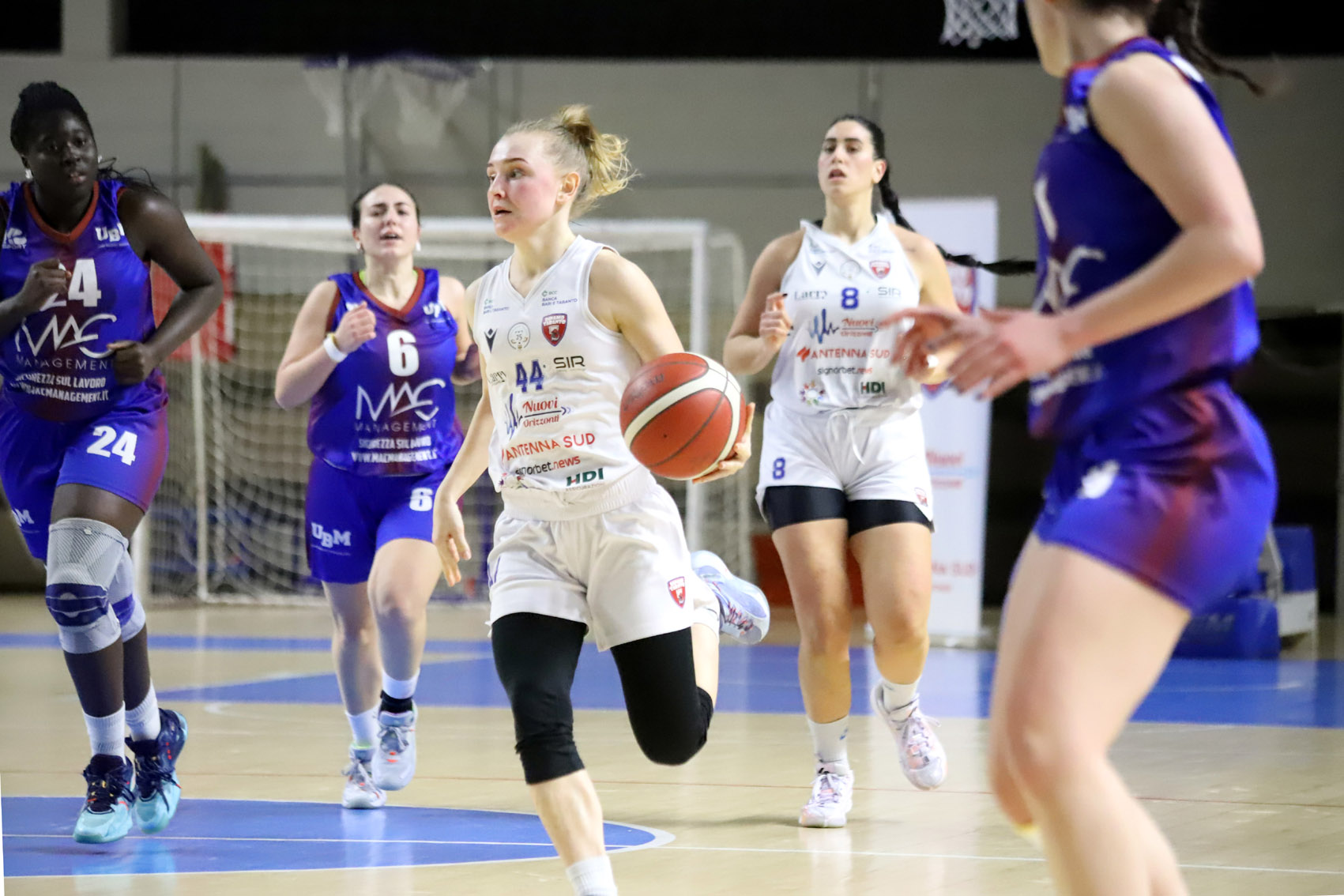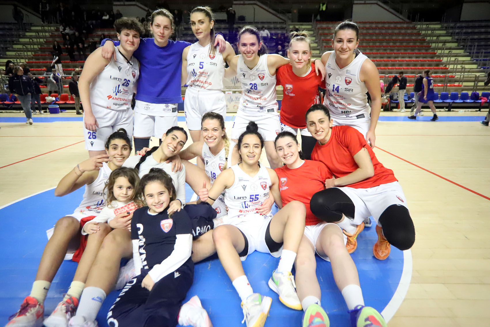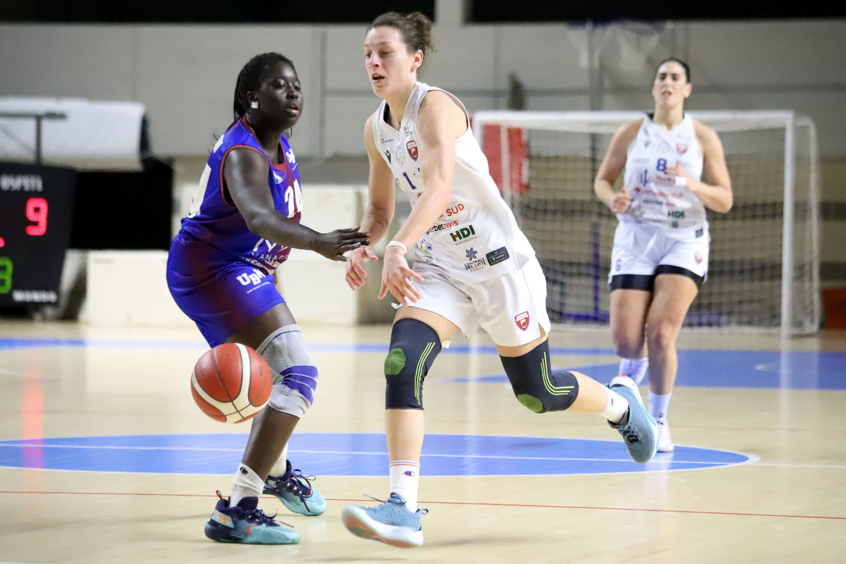 Starting lineup Nuovi Orizzonti: Smaliuk, Tagliamento, Lucchesini, Martelli, Ivaniuk. Coach Santoro risponde con Ferraro, Mottola, Diop, Greta e Alice Monda. Il primo canestro dell’incontro lo firma Tagliamento. Segue la tripla di Lucchesini, il canestro di Smaliuk per un super avvio: sul 7-0 arriva il time out dell’allenatore della Uniogirls. Lucchesini dalla lunga distanza va a segno ancora. Poi Martelli a tutto campo non si lascia tradire dall’emozione. Alice Monda, tra le ospiti, rompe il digiuno. La imita Diop dopo i canestri di Tagliamento e Lucchesini. Quest’ultima lascia il posto ad Annapia Molino, che entra subito in partita. Trascinata da Ivaniuk e dalla sue triple, la Dinamo chiude con un ampio vantaggio il primo quarto di gioco. Nel secondo periodo Maddaloni prova a inventarsi qualcosa. Ma prevale la confusione nella costruzione delle azioni che si infrangono sulla solida difesa ionica, protetta anche dalla rientrante Marzia Varvaglione. Il punteggio rimane inchiodato sul 33-9 e coach Orlando chiama time out. Nel secondo quarto di gioco si segna poco, fase nella quale, più che le difese, agli attacchi prevalgono gli errori; ma nel terzo il vantaggio raggiunge e supera i quaranta punti. Il secondo tempo è ordinaria amministrazione. Taranto gioca in scioltezza: il pick and roll di Ivaniuk per Martelli è una delizia. Migliora il rendimento offensivo di Smaliuk, a canestro va anche Carol Manco. Le padroni di casa, che ormai giocano con intensità per l’intera durata delle partite, senza cali di attenzione, non si fermano e migliorano anche il rapporto con i tiri liberi (solo 1-7 nei primi due periodi). Nell’ultimo quarto di gioco c’è gloria anche per Silvia Gobbi, a segno tre volte. Finisce tra gli applausi del sempre caldo pubblico del PalaMazzola.