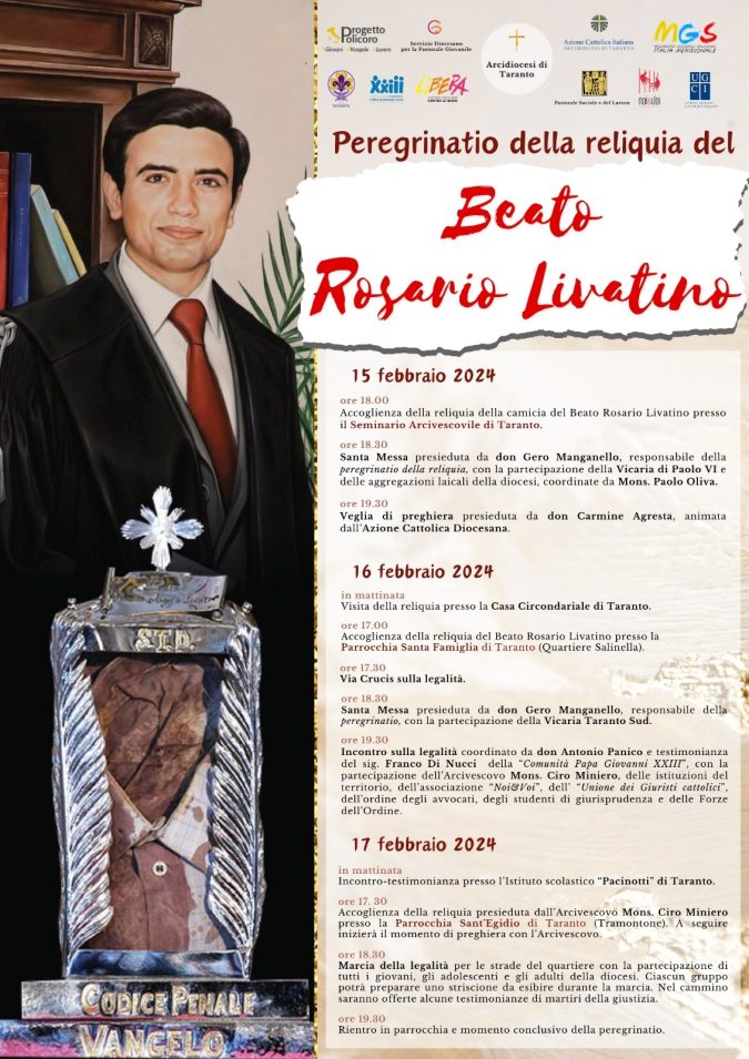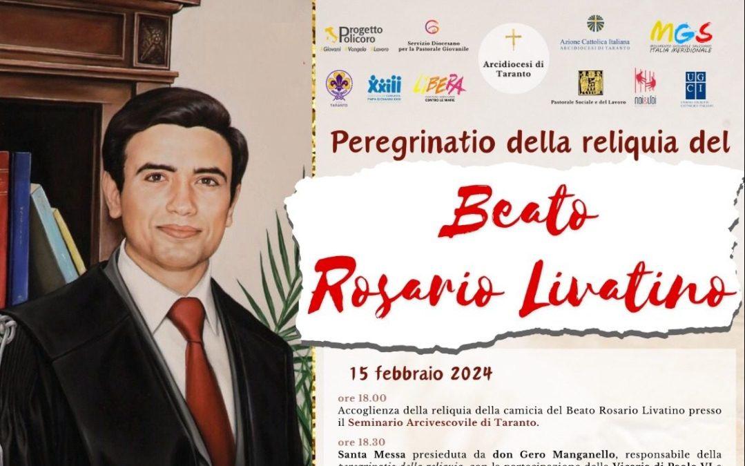 Il Servizio diocesano per la pastorale giovanile annuncia la presenza in diocesi dal 15 al 17 febbraio della reliquia del beato Rosario Livatino, martire della giustizia, consistente nella camicia  indossata nell’agguato mortale. Il reliquiario giungerà giovedì 15 alle ore 18 al seminario arcivescovile dove, alle ore 18.30, don Gero Manganello, responsabile della peregrinatio, celebrerà la santa messa alla presenza di una folta delegazione della vicaria Paolo VI e delle aggregazioni laicali coordinate da mons. Paolo Oliva; seguirà alle ore 19.30 una veglia di preghiera animata dall’Azione Cattolica diocesana e  presieduta dall’assistente unitario mons. Carmine Agresta.
