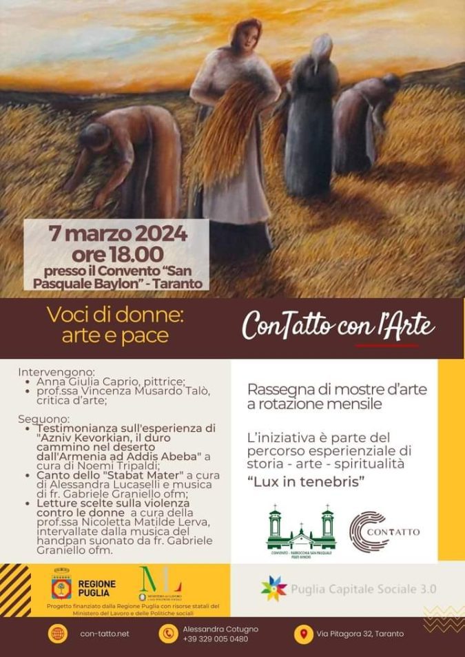 In occasione della festa della donna, “Voci di donne: arte e pace” s’intitola la serata culturale che si terrà giovedì 7 marzo alle ore 18 nel convento di San Pasquale Baylon, a Taranto, nell’ambito della rassegna di mostre d’arte a rotazione mensile “Contatto con l’arte”.