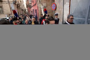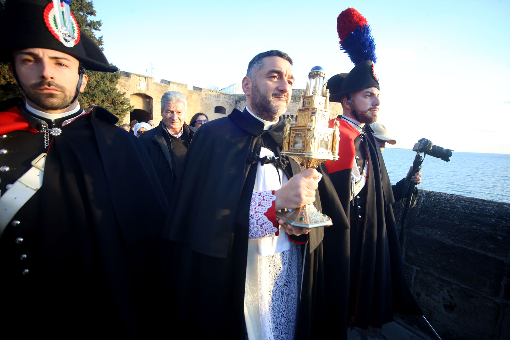 Una giornata ventosa ha caratterizzato venerdì 8 l’arrivo del reliquiario della Madonna delle Lacrime di Siracusa nella piazza d’armi del castello aragonese, dove erano in attesa i confratelli e le consorelle dell’Addolorata, il padre spirituale mons. Emanuele Ferro e don Mattia Santomarco che guidavano la recita del rosario e, naturalmente, tanta gente. Poi il caloroso applauso è risuonato fra le antiche mura, accompagnato dallo stridìo dei gabbiani in volo, quando il reliquiario, giunto in auto, è stato brandito in alto come un trofeo da don Aurelio Russo, rettore del celebre santuario siracusano a forma di goccia, proprio come una lacrima di Maria. Il reliquiario è poi passato nelle mani di don Emanuele che, al canto “Mira il tuo popolo” accompagnato dalla banda, ha guidato la processione lungo via Duomo. In cattedrale si è sostato per il saluto di don Aurelio, che ha ricordato come la lacrimazione della Madonna a Siracusa sia stato il miracolo più documentato nella storia, segno della vicinanza del Signore e di Sua Madre accanto a ognuno di noi ogni giorno, nei momenti belli ma soprattutto in quelli difficili. Successivamente il sacerdote ha raccontato la cronaca del prodigioso evento. Era il 21 marzo del 1953 quando in un’umile abitazione in via degli Orti, a Siracusa, andò ad abitare una giovane coppia di sposi, Antonina ed Angelo, ai quali, per le nozze, fu donato un quadretto della Madonna, appeso sopra il capezzale del letto. Dopo un po’ la donna si ritrovò incinta, fra la gioia dei familiari, trasformatasi in angoscia quando i medici le diagnosticatrono una malattia che allora poteva causare la morte: la tossicosi. Le fu consigliato l’aborto, ma Antonina rifiutò, anteponendo la vita del figlioletto in grembo alla sua, affidandosi alla Madonna. La donna ebbe una grave crisi epilettica quasi perdendo la vista. Qualche giorno dopo, esattamente il 29 agosto, Antonina, al risveglio, si accorse che il capezzale era bagnato: erano le lacrime che miracolosamente scendevano dall’immagine mariana. Immaginabile lo scompiglio fra il vicinato, giunto a conoscenza dell’avvenimento, soprattutto alla notizia della guarigione della donna. La lacrimazione continuò fra lo stupore di tutti e venne anche ripresa da un cineoperatore amatoriale. Il primo settembre il vescovo si convinse a inviare in quella casa una commissione scientifica, presieduta da un professionista notoriamente ateo, per verificare la veridicità della lacrimazione. I coniugi, inizialmente diffidenti ma poi convinti dal parroco che aveva benedetto le loro nozze, accettarono di mostrare il quadretto, estratto da un cassetto dov’era custodito e liberato da alcuni panni che lo avvolgevano, ovviamente zuppi d’acqua. Asciugata l’immagine, questa prese a lacrimare davanti ai loro occhi. Dall’analisi venne fuori che quel liquido conteneva urati e proteine: proprio come le lacrime umane, come infatti la commissione dichiarò.