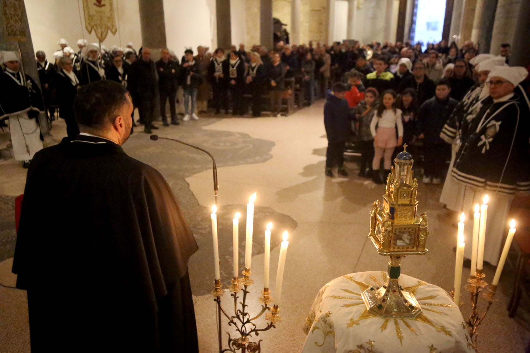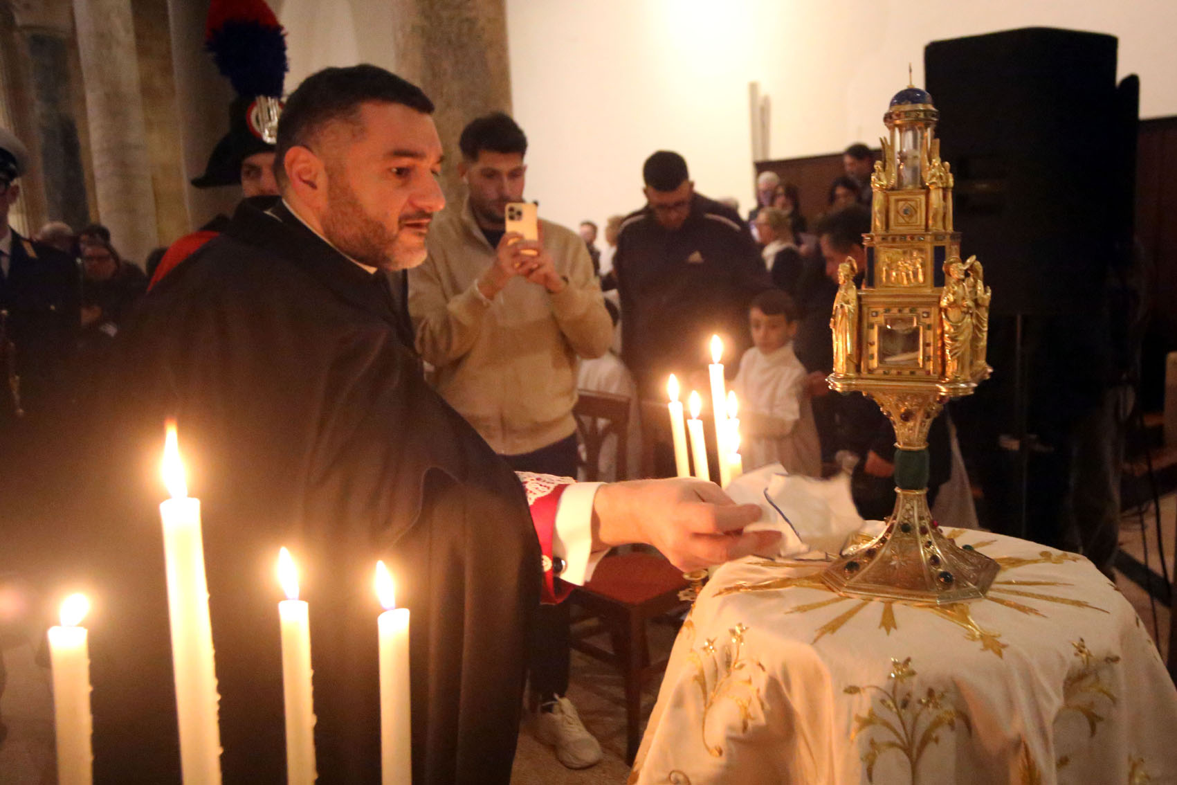 Quindi, dopo la proiezione di un documentario sulla lacrimazione, davanti al quale la folta assemblea ha mostrato grande commozione, la processione ha ripreso il suo cammino, fra tante mani che cercavano di toccare quella preziosa testimonianza dell’avvenimento soprannaturale, difeso faticosamente da don Emanuele. All’arrivo in San Domenico, il reliquario è stato posto ai piedi dell’Addolorata. Dopo il santo rosario, l’arcivescovo mons. Ciro Miniero ha celebrato la santa messa (https://www.nuovodialogo.com/2024/03/09/lomelia-dellarcivescovo-ciro-miniero-per-larrivo-del-reliquiario/). Al termine, ha avuto luogo la “24 ore per il Signore”, con molti fedeli che si sono accostati al sacramento della Riconciliazione. Il tutto, fino alla mezzanotte, quando la chiesa ha chiuso i battenti.