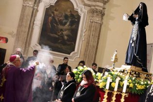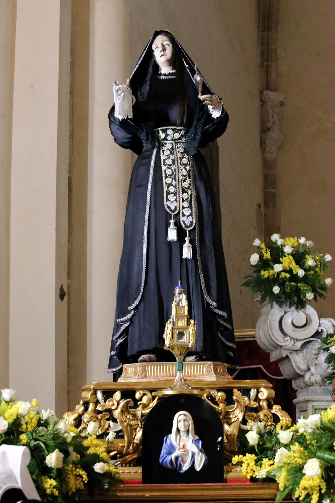 Domenica 10, sante messe alle ore 10 e alle ore 11; dopo quest’ultima ci sarà il saluto alla reliquia sulle note di “Mamma!”, la marcia funebre di Rizzola, appropriata per l’evento, che sarà eseguita dalla Grande Orchestra di fiati “Santa Cecilia-Città di Taranto”. È la stessa musica che fra qualche giorno accompagnerà, la notte di Giovedì Santo, il lentissimo incedere della Madre Addolorata lungo il pendio San Domenico. Nei suoi occhi si leggerà il dolore per il Figlio che si avvia al Golgota e anche il dolore per l’umanità che ancora non riesce a trovare la via del bene. Ma in quelle lacrime c’è anche amore, tanto, per ognuno. La Mamma però non dispera: non tutto è perduto. Proprio come ebbe a dire papa Francesco nel 2017: “Nelle lacrime della Madonna c’è speranza per i figli che torneranno a vivere”. Quella speranza che in queste ore ognuno ha potuto ritrovare negli occhi di Maria.