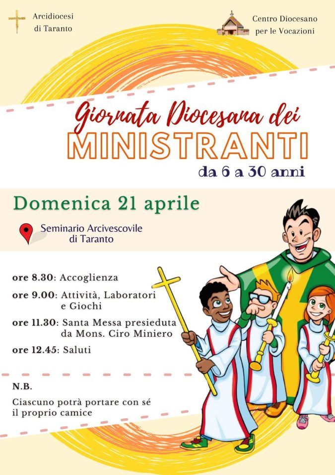 Il centro diocesano per le vocazioni terrà domenica 21 aprile al seminario di Poggio Galeso la Giornata diocesana dei ministranti, cui sono invitati i ragazzi e giovani dai 6 ai 30 anni. Il programma prevede alle ore 8.30 l’accoglienza; alle ore 9 attività, laboratori e giochi; alle ore 11.30 la santa messa presieduta dall’arcivescovo mons. Ciro Miniero; alle ore 12.45, i saluti.