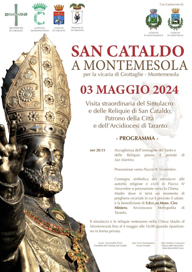 L’argenteo simulacro e le reliquie di San Cataldo vescovo nella serata di venerdì 3 maggio giungeranno a Montemesola nell’ambito della peregrinatio nelle vicarie dell’arcidiocesi. L’arrivo è previsto alle ore 20.15 nelle immediate vicinanze del portale di San Martino, da dove muoverà la processione alla volta di piazza 4 Novembre, per la consegna simbolica alle autorità civili e religiose della statua e delle reliquie. Al termine della cerimonia si proseguirà verso la chiesa madre dove si terrà un momento di preghiera vicariale con il saluto e la benedizione impartita dall’arcivescovo mons. Ciro Miniero.