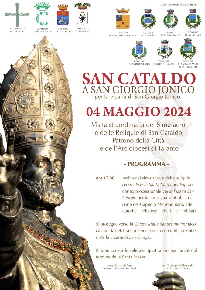 Così invece dichiara il sindaco Mino Fabbiano: “La comunità di San Giorgio jonico si appresta a ricevere la visita del simulacro di San Cataldo con grande partecipazione emotiva e con profonda e convinta fede. La visita del santo patrono dell’arcidiocesi è una novità che rinnova il legame tra la comunità cittadina e la Chiesa di Taranto. Esprimiamo grande gratitudine all’arcivescovo mons. Ciro Miniero e al parroco della basilica cattedrale, mons. Emanuele Ferro, per aver voluto onorare la nostra cittadina con questa straordinaria visita che sicuramente troverà calore e affetto tra i fedeli non solo di San Giorgio ma dell’intera vicaria che partecipa con giubilo alle celebrazioni”.