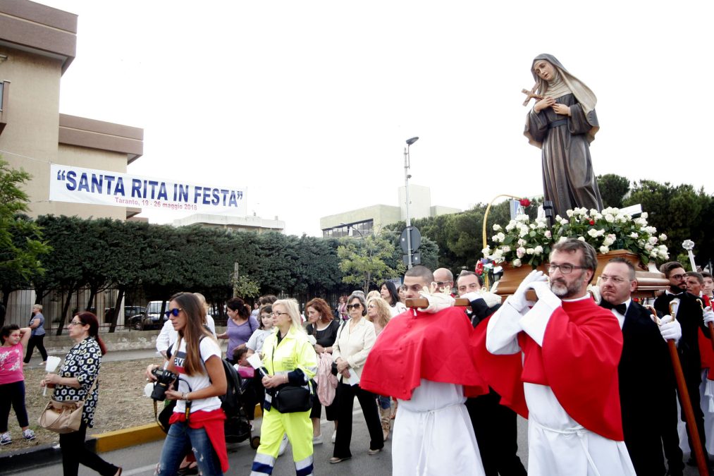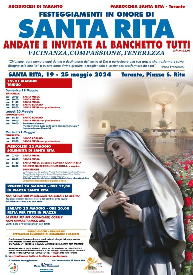Si terranno a Taranto, nella parrocchia Santa Rita, dal 19 al 25 maggio i festeggiamenti in onore della Titolare. Il parroco mons. Gino Romanazzi con la comunità invita tutti, perché, come ricorda la chiosa del manifesto, «Chiunque, ogni uomo e ogni donna è destinatario dell’invito di Dio a partecipare alla sua grazia che trasforma e salva. Bisogna solo dire “sì” a questo dono gratuito, accogliendo e lasciandoci trasformare da esso» (papa Francesco).