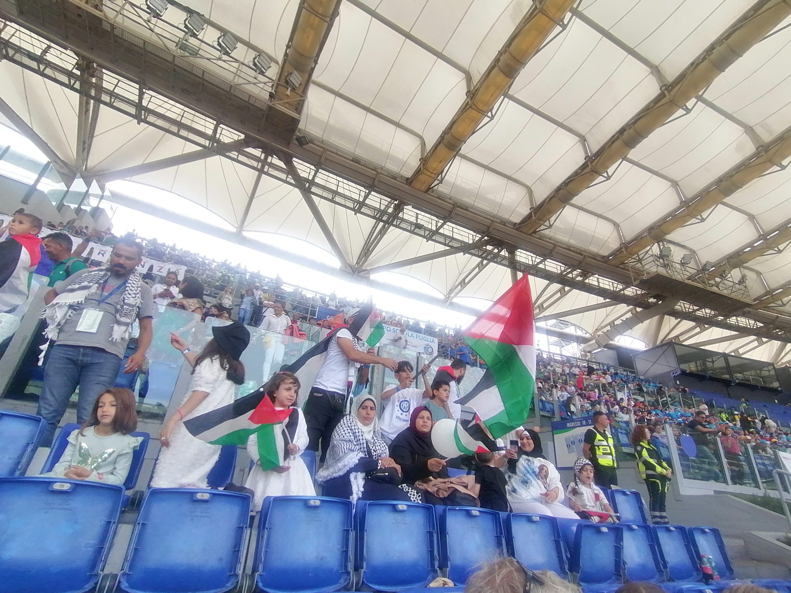 In pochissimo tempo un pezzetto della tribuna laterale della Tribuna Montemario si è trasformato in un angolo di Palestina, visibile anche da lontano per il continuo sventolio di bandiere nazionali, di costumi tipici indossati da alcune bambine che ne hanno fatto sfoggio in mezzo ai loro coetanei. Tanti sorrisi ma poca voglia di parlare.