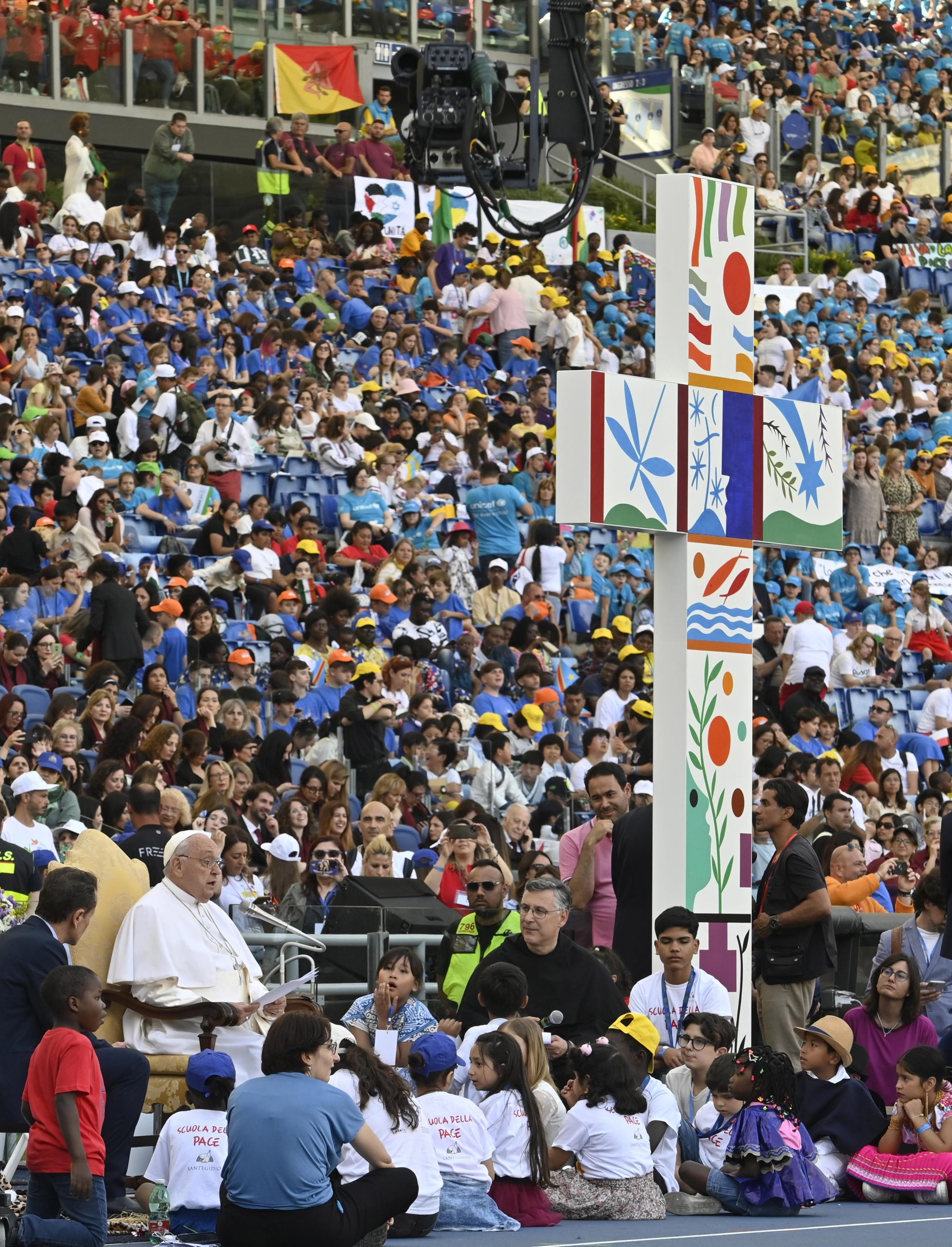 “Gerusalemme la città nuova, la città della Resurrezione. Anche noi vogliamo risorgere…”: ha cantato così Celin Ahmad Abu Tayer davanti a papa Francesco ieri allo stadio Olimpico, per la prima Giornata mondiale dei bambini. In oltre 50 mila da 101 Paesi hanno riempito gli spalti colorandolo e vestendolo a festa. Tra questi anche un gruppo di circa 60 tra bambini e accompagnatori venuti da Gerusalemme, Betlemme e Gaza.