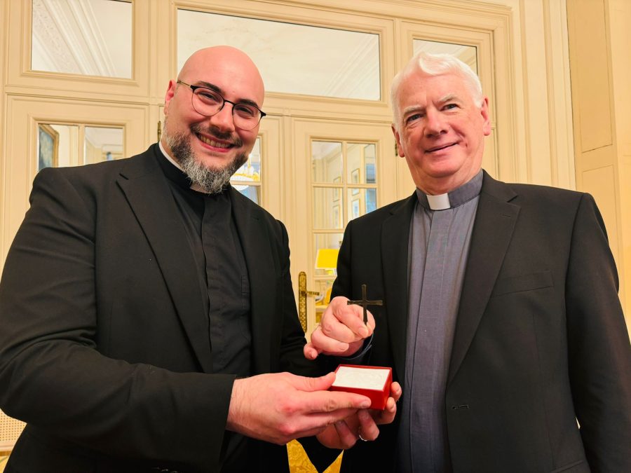 È stata nel segno del nostro patrono San Cataldo la visita avvenuta nei giorni scorsi del sacerdote tarantino don Gianluca Loperfido, attualmente in Belgio, al nunzio apostolico dell’Unione europea, l’irlandese mons. Noël Treanor. Durante l’incontro mons. Treanor ha ricevuto in dono una copia della crocetta aurea di San Cataldo, vescovo e monaco irlandese. Il nunzio apostolico ha gradito molto l’omaggio, occasione per ricordare alcuni momenti della sua permanenza a Taranto, cui ha riferito di sentirsi particolarmente legato alla città proprio grazie a San Cataldo vescovo.