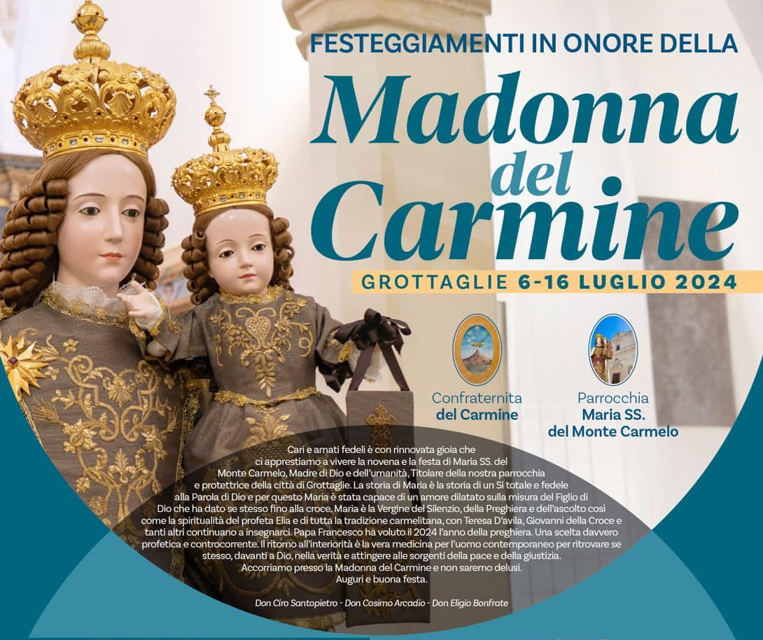 Iniziano con la benedizione delle statue restaurate di Santa Teresa e Sant’Elia e con l’intronizzazione del simulacro della Vergine, le celebrazioni per la festa della Madonna del Carmine di Grottaglie.