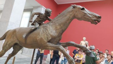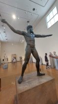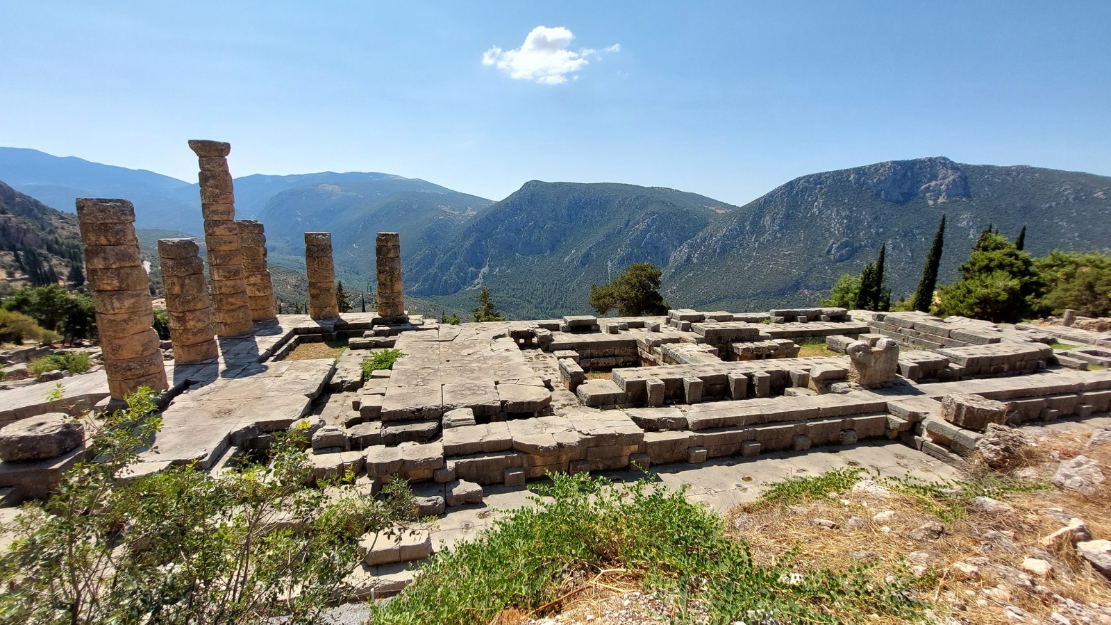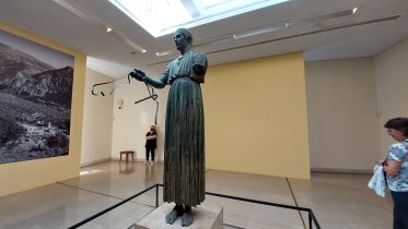 Prima del rientro ad Atene per riprendere il volo, il pellegrinaggio ha previsto una tappa speciale a Delfi, in visita al santuario di Apollo dove in antichità ci si recava per il famoso oracolo. Delegazioni reali, sovrani e letterati si recavano al tempio per ricevere oracoli sul futuro dalla Pitie, le sacerdotesse di Apollo. Il luogo è a dir poco speciale. Un museo moderno custodisce i resti prestigiosi dell’antico santuario; qui si trova la famosa Auriga di bronzo, la cui bellezza e raffinatezza vale tutto il viaggio e il perché del recarsi in Grecia. Nell’insediamento dove sorgeva il tempio, diversi sono i segni che testimoniano la storia di chi è passato presso quello che Zeus aveva segnato come l’ombelico del mondo. La vista è meravigliosa: sotto il sole di luglio, il mare brilla di azzurro e si staglia contro le pareti rocciose del dirupo sul quale sorge il santuario. Colonne e cipressi si allungano verso l’alto e tutto brilla di una luce naturale e portentosa: del resto, questa era la casa del dio del sole Apollo.