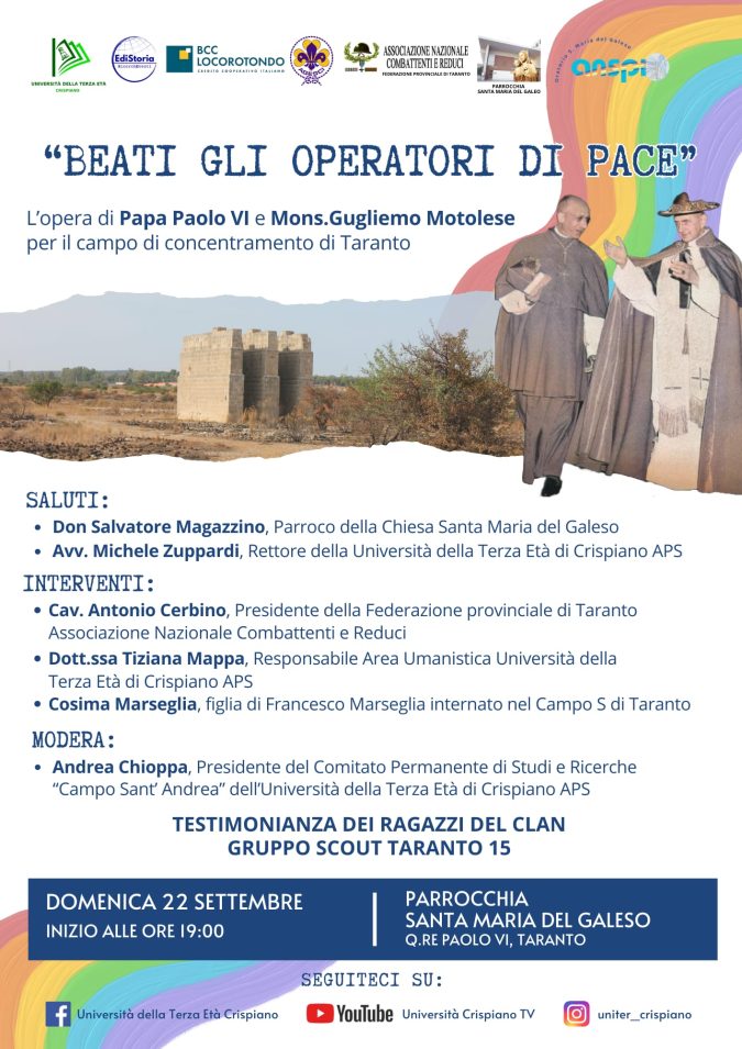 ‘Beati gli operatori di pace’ è il titolo dell’incontro che si terrà domenica 22 alle ore 19 nei locali della parrocchia Santa Maria del Galeso e che verterà sull’opera di Paolo VI e di mons. Guglielmo Motolese in favore dei reclusi del campo di concentramento ‘Sant’Andrea’, al quartiere Paolo VI, che si trovava nelle immediate vicinanze dell’attuale centro commerciale.