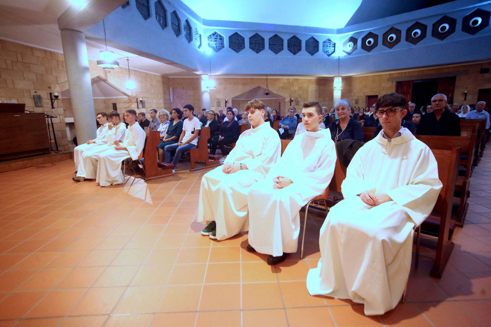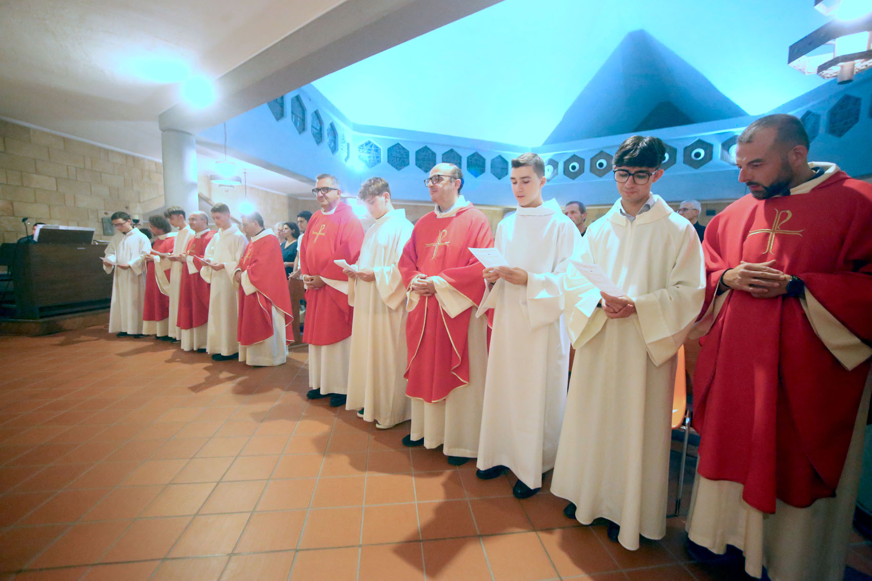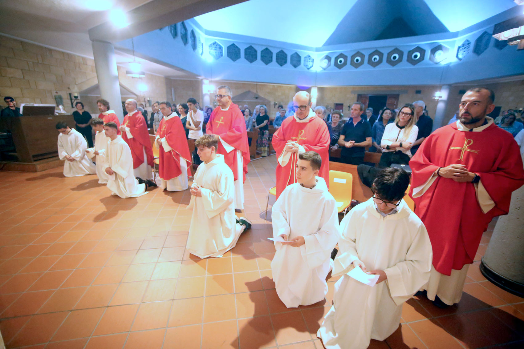 Don Francesco Maranò, rettore del seminario, e perfetto padrone di casa, ha presentato i 6 seminaristi. Hanno età diverse, alcuni sono già al terzo anno di formazione, altri al secondo, ed uno inizia il primo anno. Vengono da differenti parrocchie della diocesi, e rappresentano il cammino di una comunità ecclesiale che cerca attraverso gesti concreti di testimoniare la Parola di Dio. Intorno a loro familiari commossi, docenti che li sostengono negli studi, noi serrani e tanti sacerdoti. Un momento di festa e di gioia piena che è continuato, dopo la celebrazione, con un momento conviviale.