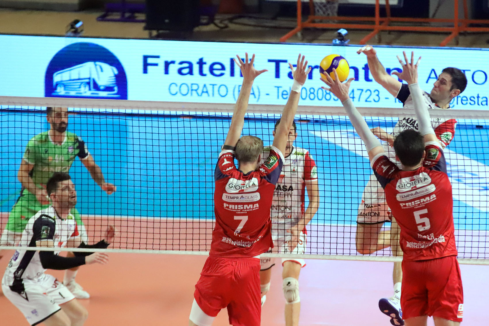 Ionici sempre avanti nel primo set, con primo allungo nella fase centrale: l’ace di Fabrizio Gironi (14-7), che sarà eletto mvp dell’incontro con 25 punti, costringe al timeout coach Ortenzi. Ma la musica non cambia. Il divario, anzi, aumenta sino alla chiusura del parziale. Nel secondo c’è la reazione di Grottazzolina (5-2) che approfitta di alcuni errori dell’attacco di Taranto. Antonov in battuta mette in difficoltà anche la ricezione dei padroni di casa. La Prisma si rifà sotto (10-12) ma poi soffre il servizio di Danny Demyanenko. Sarà lo stesso centrale nato in Canada ad essere decisivo nel finale. Nel terzo set “gioielli” avanti sino alle due battute vincenti di Antonov (12-12). Gironi capitalizza un lungo entusiasmante scambio (14-12). A seguire, arriva il muro di Alletti. La Prisma cresce in battuta e si aggiudica il parziale. Poi torna in campo un po’ deconcentrata (sotto 1-5), recupera presto il gap; il livello sale, a beneficio del pubblico del PalaMazzola (1300 spettatori), e l’ultima parte del set è al cardiopalma. La vittoria arriva ai vantaggi. L’ultimo punto porta la firma di Gironi.