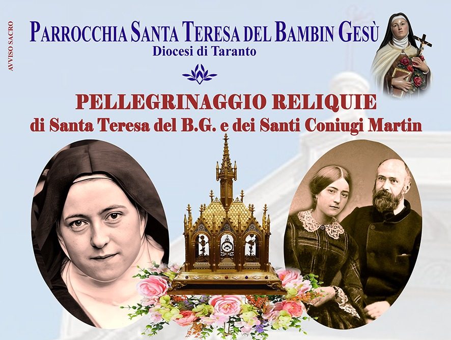 Sabato 9, giungeranno a Taranto, nella chiesa a lei intitolata, le reliquie di Santa Teresa del Bambino Gesù e quelle dei suoi santi genitori, Luigi e Zelia Martin, questi ultimi beatificati da Benedetto XVI nel 2008 e proclamati santi nel 2015 da papa Francesco durante il Sinodo sulla famiglia.