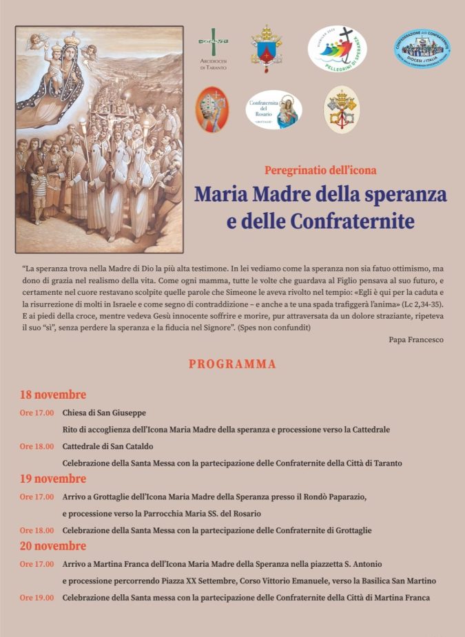 “Al fine di accogliere con particolare devozione la sacra immagine di ‘Maria, Madre della Speranza e delle confraternite’ – spiega mons. Paolo Oliva, vicario episcopale per il laicato – si invitano le confraternite dell’arcidiocesi a intervenire numerose sia all’accoglienza dell’immagine sia alla celebrazione della santa messa”.
