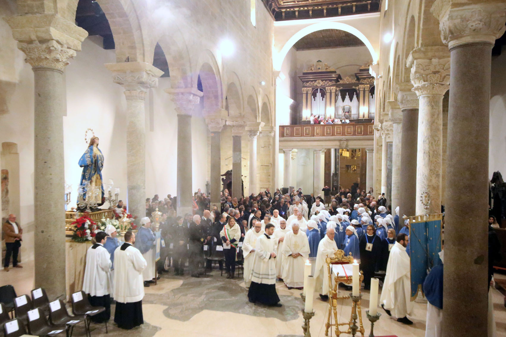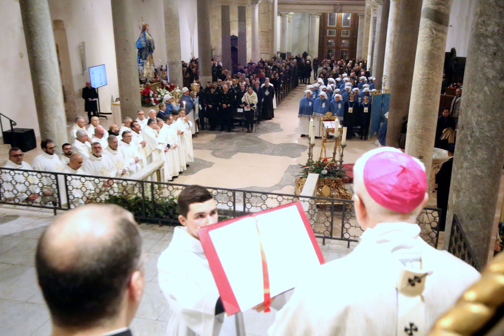 È stata ben accolta dai tarantini, a giudicare dalla folta partecipazione registratasi in cattedrale, la novità del solenne pontificale dell’Immacolata anticipato alla vigilia della sua festa, sabato 7. Data la grande devozione del popolo di Dio che affolla le chiese il giorno di questa solennità,l’arcivescovo ha inteso in tal modo, senza alterare la vita della comunità, favorire la partecipazione alla celebrazione dei parroci, dei consigli pastorali delle comunità, dei consigli di amministrazione delle confraternite e delle rappresentanze delle associazioni e dei movimenti ecclesiali. E la risposta è stata secondo le aspettative, così come dei fedeli che hanno affollato con largo anticipo i banchi della basilica, attendendo l’ingresso della processione introitale. Numerosa, in particolare (e non poteva essere altrimenti) la rappresentanza della confraternita dell’Immacolata, l’unica a indossare l’abito di rito. Molte le autorità civili e militari fra i banchi, con l’assessore comunale alla pubblica istruzione, Federica Simili, con la fascia tricolore, in rappresentanza del sindaco Rinaldo Melucci, che ha disposto, come avviene ogni anno, la presenza del gonfalone municipale.