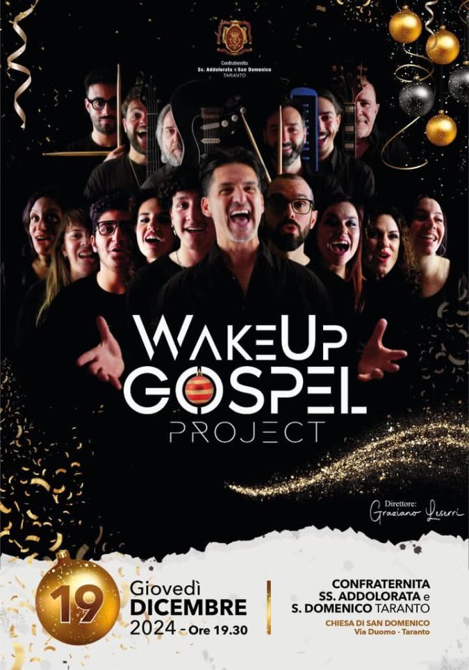 Giovedì 19 dicembre nella chiesa di San Domenico alle ore 19.30 i “Wake Up Gospel Project” saranno protagonisti del concerto natalizio, a ingresso gratuito, organizzato dalla confraternita dell’Addolorata. Diretto dal m° Graziano Leserri, questo gruppo musicale, nato nel 2005 a Martina Franca e affermatosi da subito come nuova e travolgente realtà italiana della Gospel Music, realizza un progetto finalizzato a unire assieme qualità musicale e testimonianza, divertimento e interazione col pubblico, rompendo la formalità tipica del concerto. I riconoscimenti non sono mancati, tant’è che i “Wake Up Gospel” sono stati premiati nel 2011 a Torino come miglior gruppo gospel italiano, annoverando sei primi premi a concorsi internazionali, diversi lavori discografici e presenze nei principali festival nazionali ed internazionali di questo genere musicale.