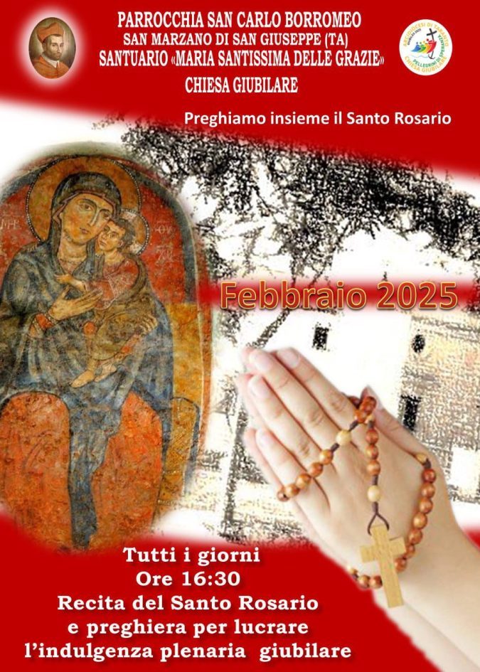 Nel santuario rupestre intitolato a Maria Santissima delle Grazie, in San Marzano di San Giuseppe, a partire dal 2 febbraio, ogni giorno, alle ore 16.30, ci sarà la recita del santo rosario con la preghiera per lucrare l’indulgenza plenaria giubilare. Nella medesima chiesa, ogni domenica, alle ore 17, viene celebrata la santa messa.