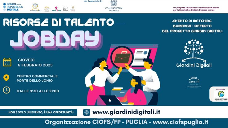 Giardini digitali, progetto selezionato e sostenuto dal Fondo per la Repubblica digitale – impresa sociale, prosegue nel suo percorso volto a fornire competenze digitali a persone che hanno perso il lavoro o non lo hanno mai avuto. Il percorso formativo a cura del Ciofs/fp-Puglia ets e dalle associazioni: SurfHERS aps, Visonari ets/aps e Stella marina aps, patrocinato da Confindustria Taranto, arriva ad uno step importante, rappresentato da un evento unico nel suo genere, che sarà capace di coinvolgere 35 realtà imprenditoriali le quali entreranno a pieno titolo nell’iniziativa e che si faranno carico del continuum di formazione, promozione e inserimento professionale degli oltre 80 allievi. L’evento ‘Risorse di talento’, parte integrante del progetto, si terrà il 6 febbraio nel Cortile dei pescatori di Porte dello Jonio, Taranto, dalle ore 9.30 alle 21.