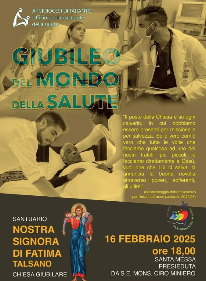 il primo avrà luogo domenica 16 febbraio con il Giubileo del mondo della salute e prevede alle ore 18 la celebrazione eucaristica presieduta dall’arcivescovo mons. Ciro Miniero nella parrocchia Nostra Signora di Fatima a Talsano, santuario mariano e chiesa giubilare. A questo evento giubilare sono particolarmente invitati, insieme ai loro familiari, tutti i malati, i disabili e le figure professionali legate al mondo della sanità (medici, infermieri, operatori sanitari, volontari in ambito sanitario, operatori pastorale della salute ecc.).