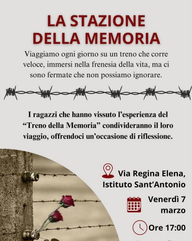 S’intitola ‘La stazione della memoria’ la manifestazione che si terrà venerdì 7 alle ore 17 nel salone dell’istituto Sant’Antonio (ingresso da via Regina Elena). Si tratta di un percorso sulle orme della storia per costruire un presente più consapevole, organizzato in parrocchia dagli studenti del liceo Aristosseno che hanno vissuto l’esperienza del ‘treno della memoria’, i quali condivideranno le esperienze del loro viaggio, offrendo spunti di riflessione.