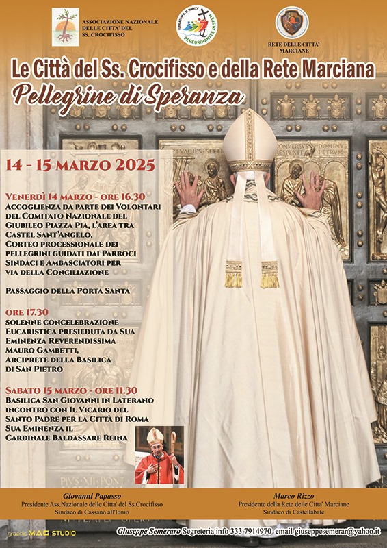 Venerdì 14 e sabato 15 marzo l’Associazione nazionale delle Città del Crocifisso e la Rete delle città marciane, guidati dai rispettivi presidenti Giovanni Papasso (sindaco di Cassano all’Ionio) e Marco Rizzo (di Castellabate), celebrano, nella Città del Vaticano, il Giubileo con una delegazione di circa 300 pellegrini provenienti dalle ottanta municipalità che seguono i due percorsi associativi, accompagnati dai primi cittadini, parroci e amici ambasciatori.