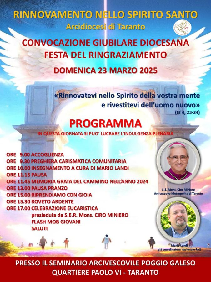 Il programma della giornata, nel corso della quale si potrà lucrare l’indulgenza plenaria, prevede alle ore 9 l’accoglienza, alle ore 9.30 la preghiera carismatica comunitaria, alle ore 10 l’insegnamento a cura di Mario Landi, già coordinatore nazionale RnS, alle ore 11.45 pausa, alle ore 11.45 si rammenteranno i momenti più significativi del cammino effettuato lo scorso anno, alle ore 13 pausa pranzo, alle ore 15 la ripresa, alle ore 15.30 il ‘roveto ardente’ e alle ore 17 la celebrazione eucaristica presieduta dall’arcivescovo mons. Ciro Miniero, con il flash mob dei giovani e la conclusione con i saluti.