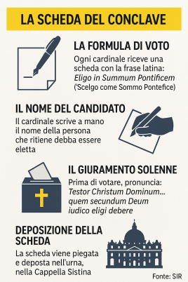 Il rito della votazione avviene in tre fasi: preparazione, scrutinio e accettazione. Ogni cardinale, a turno, si reca all’altare sotto l’affresco del Giudizio Universale, tiene in alto la scheda ripiegata e la deposita nell’urna pronunciando il giuramento. Al termine, tre scrutatori estraggono le schede, le leggono ad alta voce e registrano i voti. Se nessuno raggiunge il quorum, le schede vengono bruciate con sostanze che producono fumata nera. In caso di elezione valida, si produce la fumata bianca. Segue l’accettazione da parte dell’eletto e la scelta del nome papale.